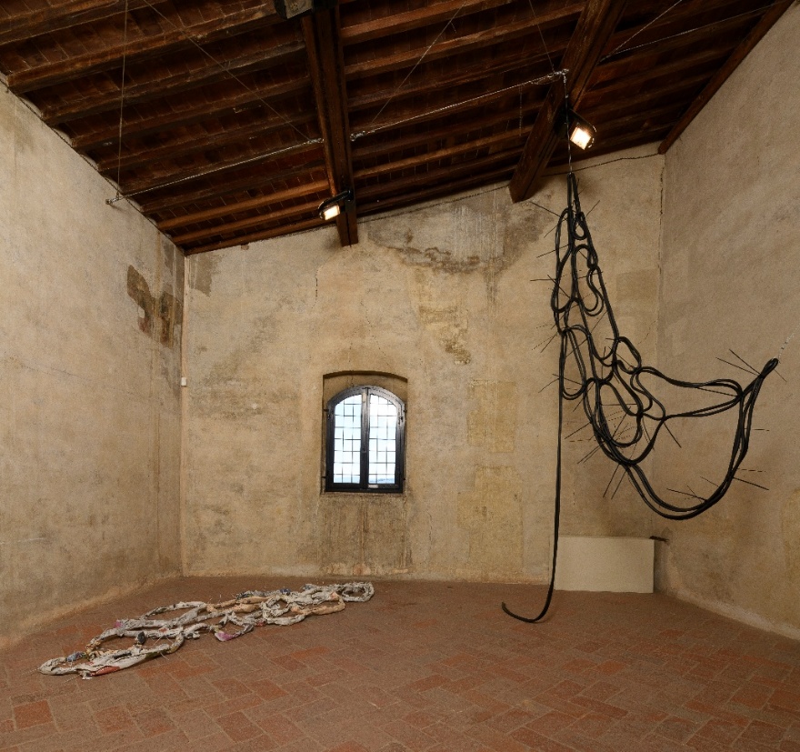 Il Palazzo Pretorio è di una bellezza architettonica e artistica sconcertante, ma allo stesso tempo era sede dei Vicari fiorentini, dove si amministrava la giustizia, c’erano infatti anche le carceri dove venivano torturati i prigionieri. Questo fascino così duro e l’idea che un luogo di tale bellezza avesse un passato così aspro, ha ispirato l’artista a trovare una chiave di lettura per riconnettersi con l’attualità e con la realtà. Ovviamente si tratta sempre di un linguaggio artistico, ma le modalità con cui Valentina lavora con la verità dei materiali — per lo più semplici, ma di derivazione industriale — rappresenta per lei un modo autentico di connettersi con la dimensione reale. L’artista costruisce un ponte tra la realtà evocata dal luogo (ma anche l’immaginario legato a Fiammetta e il tentativo di Boccaccio, di trasporre nel Decameron la realtà del suo tempo) e il nostro presente: sono piani di esistenza che si intrecciano e si riflettono l’uno nell’altro. Palazzari ha voluto creare dei segni plastici che hanno spinto in avanti la sua ricerca e instaurato formule dialogiche con il palazzo. Il tema di questa mostra è il lavoro nello spazio e, attraverso i “segni” dell’artista, il palazzo si trasforma da contenitore a contenuto, l’ambiente stesso diventa opera, non è presente dicotomia tra questa e il luogo».
