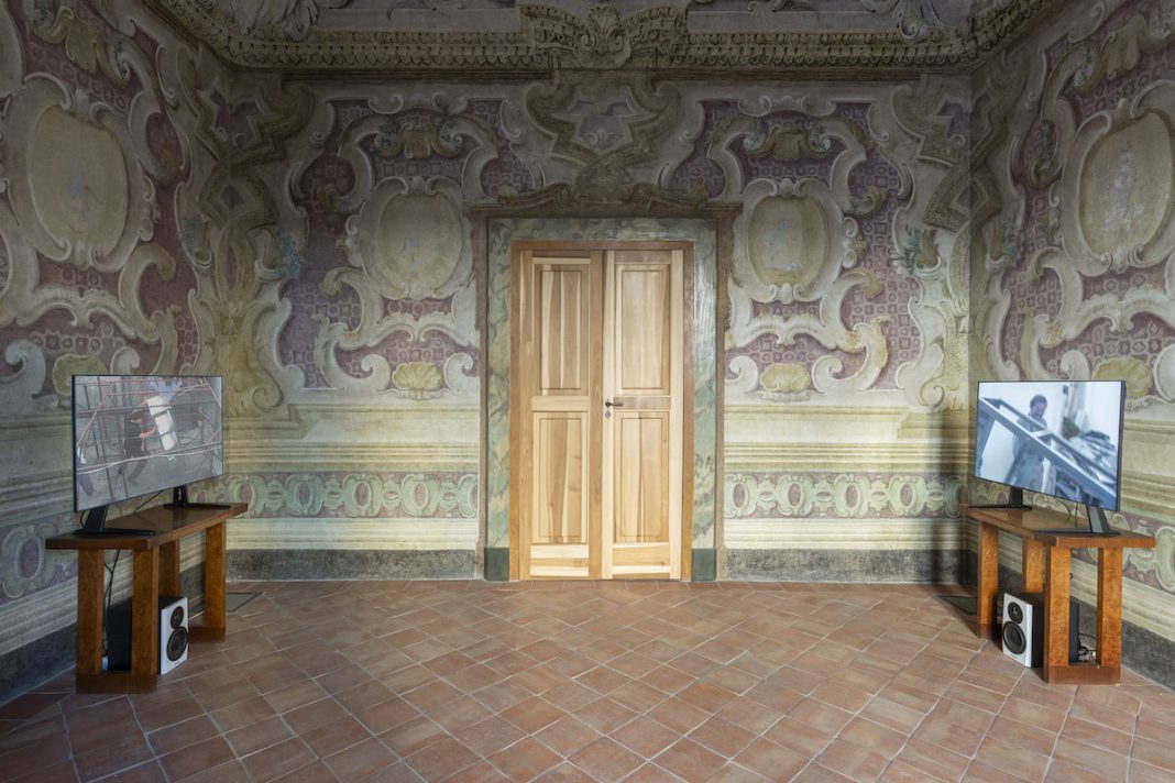 Oltre alle opere realizzate per la mostra, sono presenti dei video realizzati nei primi anni duemila. In particolare Because (2008) è un lavoro in cui vediamo la nuca dell’artista di spalle che si appoggia ad un muro dove notiamo una decorazione con due angioletti: questo è un riferimento all’architettura e alle pareti affrescate del palazzo. Un tratto caratteristico dell’artista, infatti, è lavorare con quello che c’è, inserendosi nel contesto con il suo corpo, che ne diventa l’elemento preponderante.