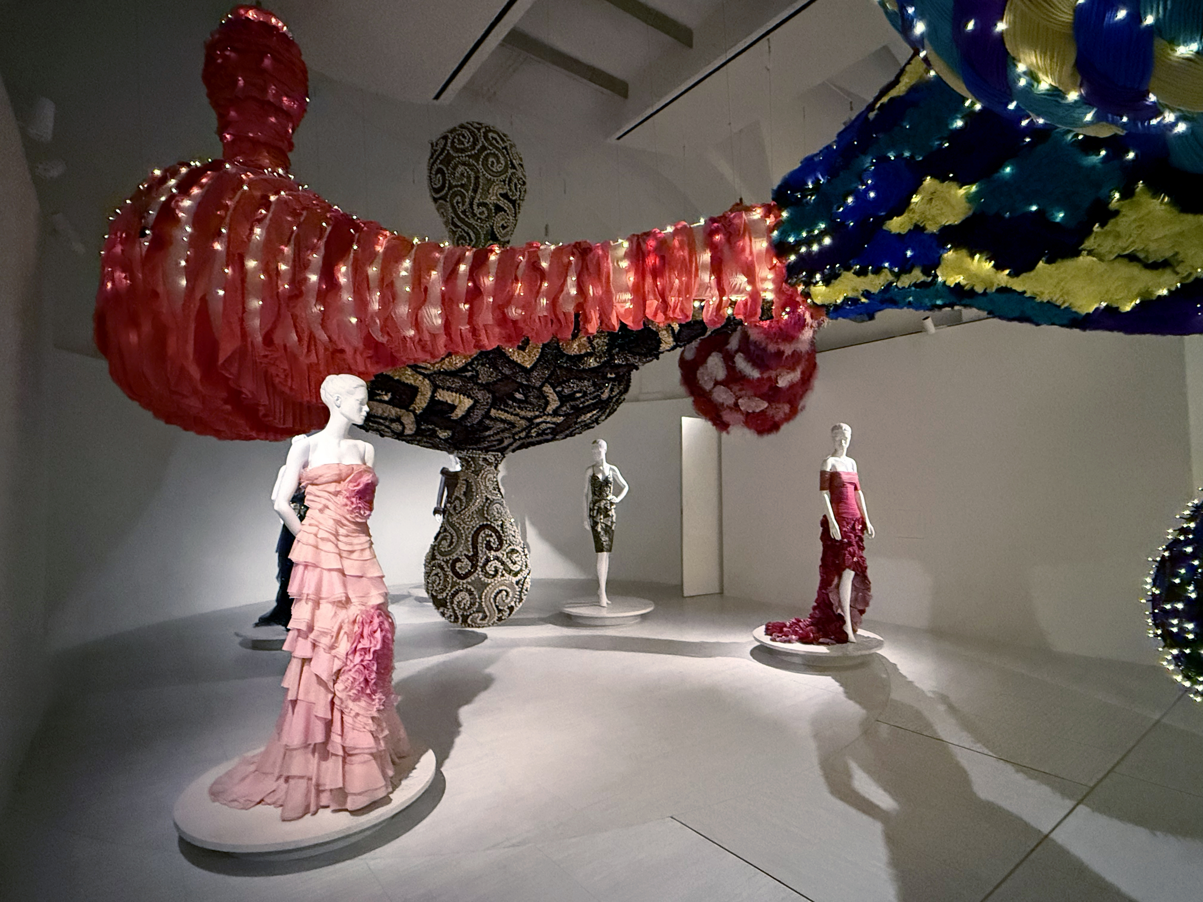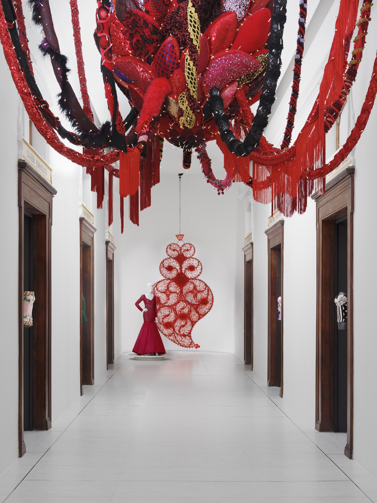 Poi incontriamo Red Independent Heart #3, Witch Mirror and Sacro Cuore, un’esplorazione del colore rosso attraverso il ricamo, rievocando la cultura portoghese e i suoi simboli sacri. Un cuore in filigrana gira su se stesso, mostrando le sue diverse facce, a ricordarci che l’amore muta forma nella sua permanenza. Da qui si dipana un lungo corridoio di corpetti e giacche haute couture del Mestro Garavani, a condurci nella sala Full Steam Ahead (Red), dove un ampio fiore di loto di ferri da stiro, mobile e meccanico proprio come vorrebbe David Cronenberg, si apre e chiude, come allusione alla ciclicità del processo vitale e alla ripetitività della vita domestica.