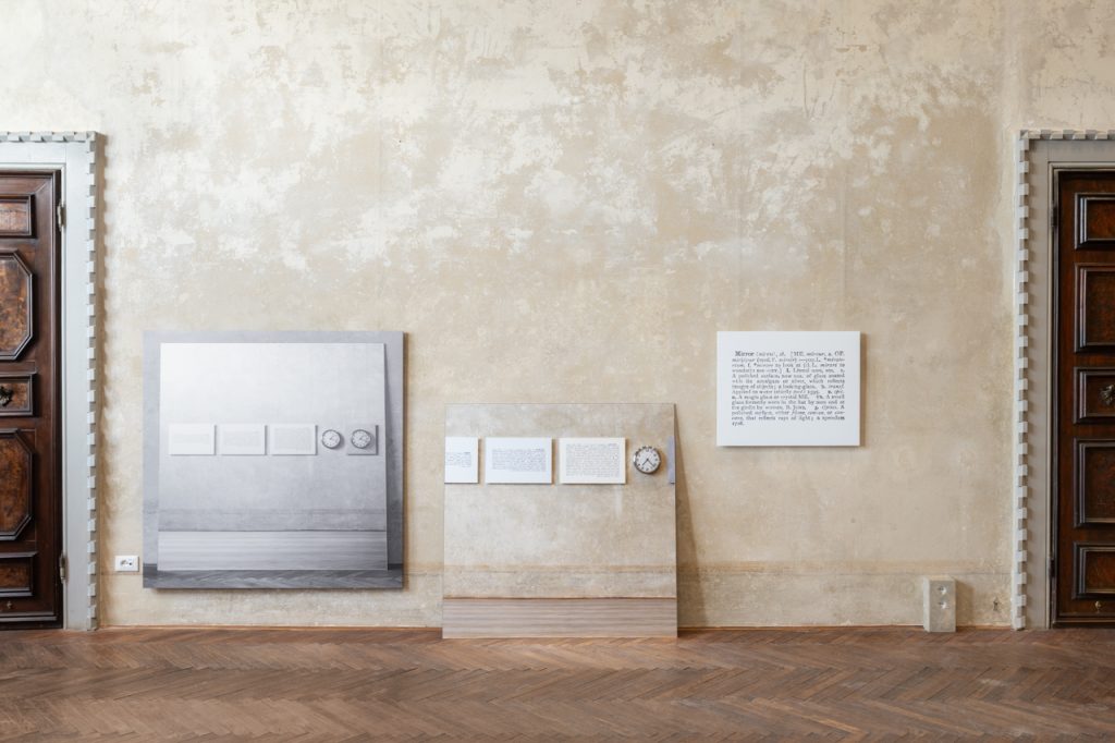 Tra questi, le ormai celebri Proto-Investigations, in cui Kosuth affianca un oggetto comune — indimenticabile l’esempio della sedia — alla sua fotografia e alla sua definizione. In mostra è presentata One and Three Mirrors (1965), che introduce una variazione decisiva: lo specchio. Riflettendo lo spettatore e l’ambiente circostante, l’opera rende esplicita la natura relazionale del significato, riprendendo le indagini di Ludwig Wittgenstein, secondo cui esso emerge sempre dall’uso, dal contesto e dalla situazione.