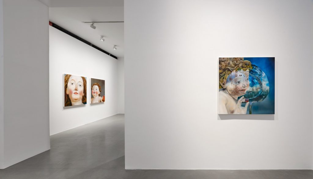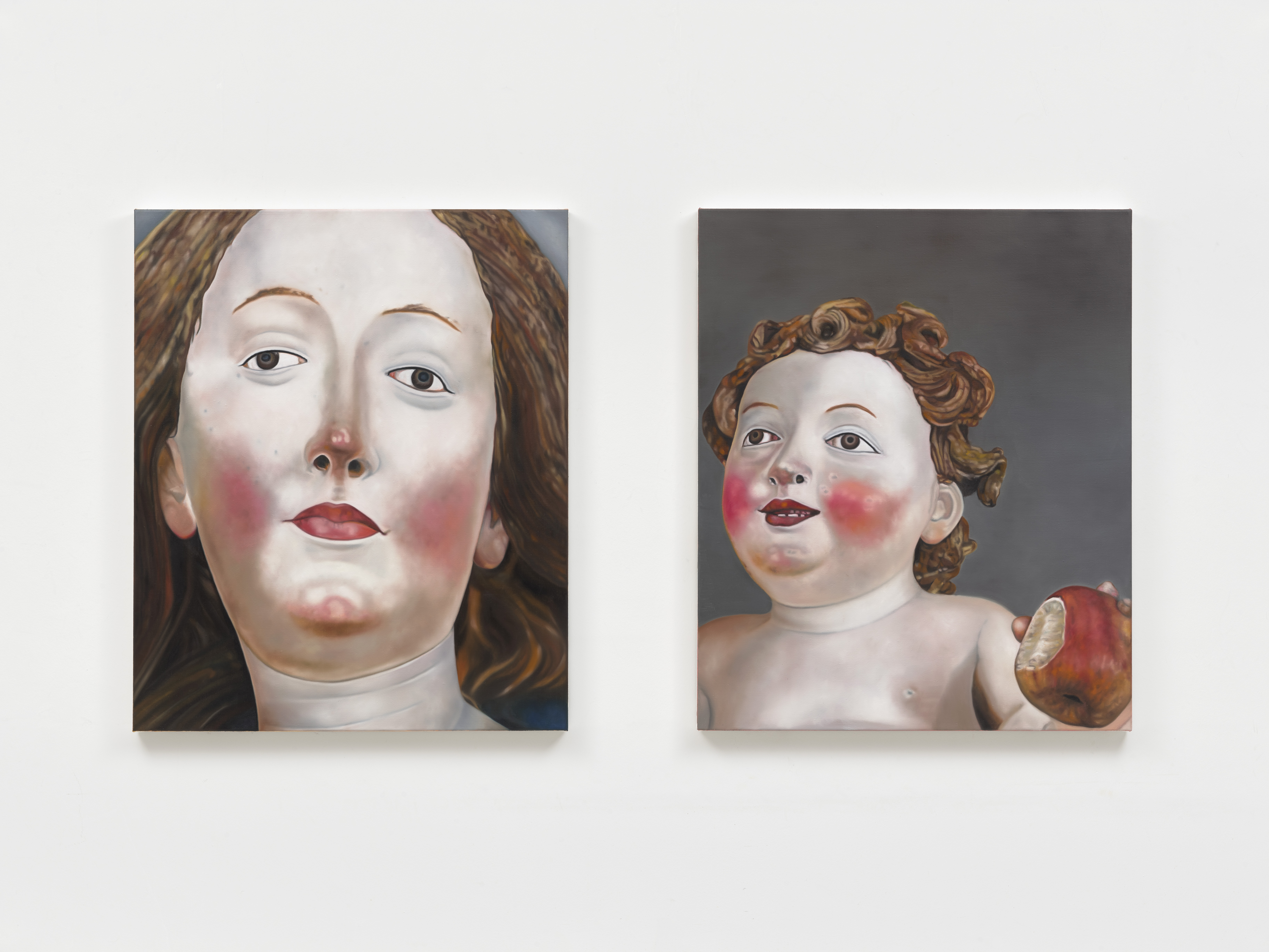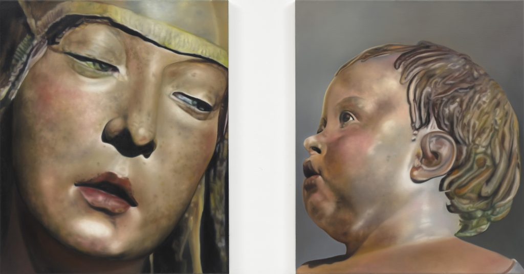 «Le immagini provengono da altre immagini. Le figure che ho dipinto oscillano tra la scultura figurativa e la realtà, diventando più reali nella raffigurazione che nella scultura». In questo modo Kneffel parla dei lavori in “Face of a Woman, Head of a Child”, per la maggior parte dittici in cui si affiancano il volto di una donna e quello di un bambino. Sono immagini ricavate dagli scatti che Kneffel ha realizzato nel corso degli anni, durante i suoi viaggi. Nate dall’interesse per le figure sacre, queste fotografie di sculture del primo Rinascimento Nordico, alcune anonime, altre note, sono i soggetti della serie inedita esposta da Gagosian. Qui, la coppia religiosamente tipizzata della Madonna col Bambino si libera delle letture d’iconografia sacra per lasciare la scena a una fisiognomica che parla di individui.