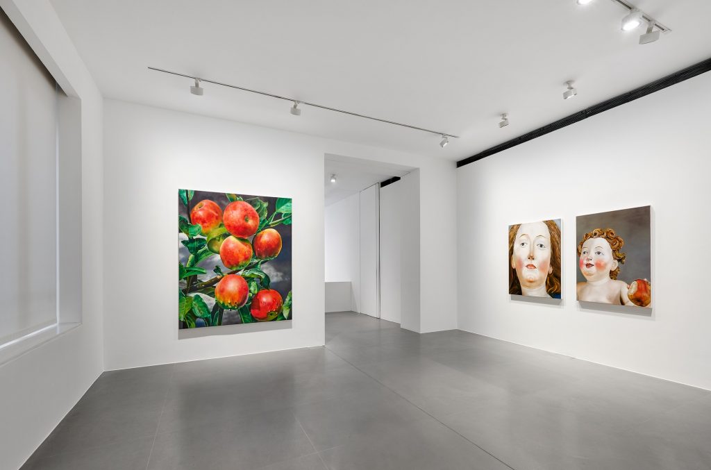 Nelle tele di “Face of a Woman, Head of a Child” spariscono veli e aureole e, tramite una soluzione d’inquadratura di primissimo piano, spiccano i particolari di facce di donne e bambini, ognuno con la propria espressività. È su quest’ultima che Kneffel pone l’accento, restituendo la policromia dei visi scolpiti e accentuandone le forme singolari. Così, le sculture rinascimentali sono abilitate a mostrare le caratteristiche di volti unici ma comuni, come quelli della coppia in cui l’artista ha ritratto due amici. Una stessa sfumatura pop che torna anche nel bimbo che disegna con un acino d’uva il vetro appannato davanti a lui.