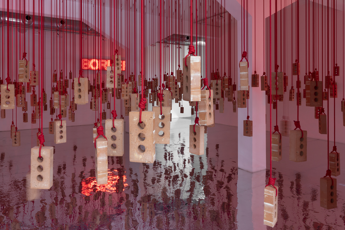 Alla gabbia di mattoni si contrappongono delle scritte al neon alle pareti, giocando sulle parole e sul loro specifico significato, da “pericolo – terrore – confine” a “rabbia – errore – ordine”.