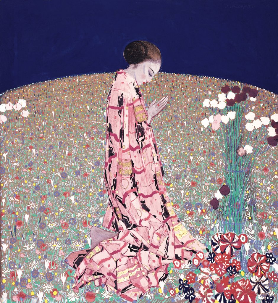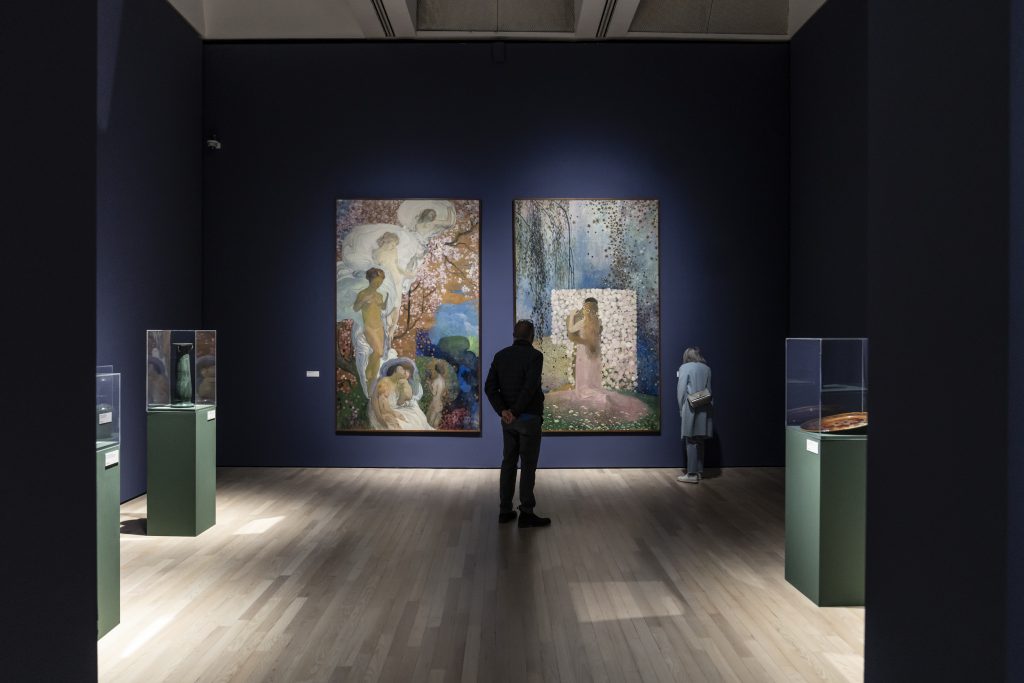 Incontriamo in principio Vittorio Zecchin, artista e artigiano di origini muranesi, con un corpus di opere che spazia dalla pittura alla creazione di mobili, arazzi, mosaici, pizzi e vetri. Affascinato dal decorativismo di Klimt, Zecchin diede forma a un immaginario onirico, fiabesco e orientaleggiante attraverso un linguaggio che accentuava la bidimensionalità e il carattere ornamentale dello stile secessionista e, al contempo, trovava le sue radici nelle vetrate antiche e nei mosaici bizantini. Come lui, Galileo Chini fu pittore, ceramista, decoratore. Nei dipinti in mostra, del ciclo La primavera classica (1914) la profusione di motivi ornamentali che alternano forme circolari e triangolari, all’interno di cascate di fiori è di evidente matrice Klimtiana. Come anche le figure, composte verticalmente e scorrevoli secondo un moto ascensionale accanto al fluire delle decorazioni.