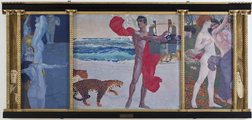 Il percorso prosegue con i cugini Piero e Guido Marussig ispirati dall’ambiente veneziano, e Viktor von Thümmel (italianizzato Vito Timmel) che si formò invece a Vienna. Timmel fu sensibile al fascino delle figure femminili di Klimt, come ben esprimono le opere Gli infelici (Gli eroi) e Fochi. Anche Luigi Bonazza studiò a Vienna assorbendo il linguaggio Jugendstil e il gusto della Secessione e misurandosi con le tematiche del sogno, del mito e dell’allegoria. Sua è La leggenda di Orfeo, una straordinaria raffigurazione sospesa tra amore e morte, tra spirito apollineo e dionisiaco, nella struttura tripartita e nella preziosa cornice decorata in ottone e avorio con le allegorie della Poesia e della Musica. Erano gli anni della gesamtkunstwerk (opera d’arte totale), anche se il termine fu coniato per la prima volta nel 1827 da Trahndorff e poi utilizzato dal 1849 da Richard Wagner. Il termine indicava un ideale in cui convergevano musica, drammaturgia, coreutica, poesia e arti figurative al fine di realizzare una perfetta sintesi delle diverse arti: il tema di Orfeo, caro a molti artisti di inizio secolo e proiettato in un ambito di universalità, sembrava incarnare il potere di fondere, in misura superiore a qualsiasi altra espressione, sensazioni tattili, visive e sonore.