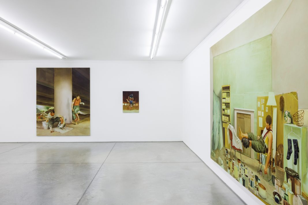 La creazione cui assistiamo in tele come Meriti e colpe, La traversata e Necessaria seconda capriola – le prime due di grande formato e tutte tre esposte nella Pattern Room – è inconsapevole, forse involontaria, e ha origine da una ferita su una gamba, di cui il soggetto universale ha costante cura, anche con un fare quasi magico, un po’ sciamanico, servendosi di erbe naturali (Ramo delle confluenze) o avvolgendola con un telo (Perdere l’eroe conservare la ferita), perché la ferita è feconda, è materia germinativa che si dà come insorgenza di altre vite e direzioni. Siamo nel regno, allegorico e mitologico, della partenogenesi, ovvero un tipo di riproduzione in cui la cellula-uovo è slegata dall’atto fecondativo che si richiama, per consonanza, a un metodo di riproduzione agamica, che in botanica prende il nome di tecnica della margotta – che consente di ottenere nuove piante scortecciando una parte di un ramo e racchiudendolo, dopo averlo circondato di terra, in un telo per pacciamatura di plastica nera: lo stesso che vediamo annodato intorno alla gamba dell’umano raffigurato (anche) in Tutte le mani dormono – l’ultimo lavoro in termini di realizzazione, che ha il sapore di una contemporanea Deposizione.