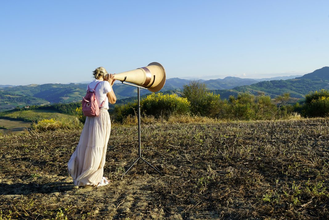 In un dialogo con la materia e con la delicatezza richiesta da un materiale fragile come la cera, Sergia Avveduti in Calanchi, restituisce con un intervento minuzioso le pieghe naturali che caratterizzano il paesaggio. Diverso l’approccio di Juan Esteban Sandoval, che in Escuchador 08 trasforma l’argilla locale in un corno acustico. La partecipazione diventa così attiva e lo spettatore è chiamato a “sentire” il paesaggio, non attraverso un suono, ma mediato dalla materia stessa. Nella dimensione performativa si inserisce Cuneiforme di Italo Zuffi: un chiodo da montagna in ceramica conficcato nelle pendici dei calanchi. L’azione, documentata fotograficamente, si pone come un gesto artificiale che incide il suolo, lasciando una traccia nel paesaggio.