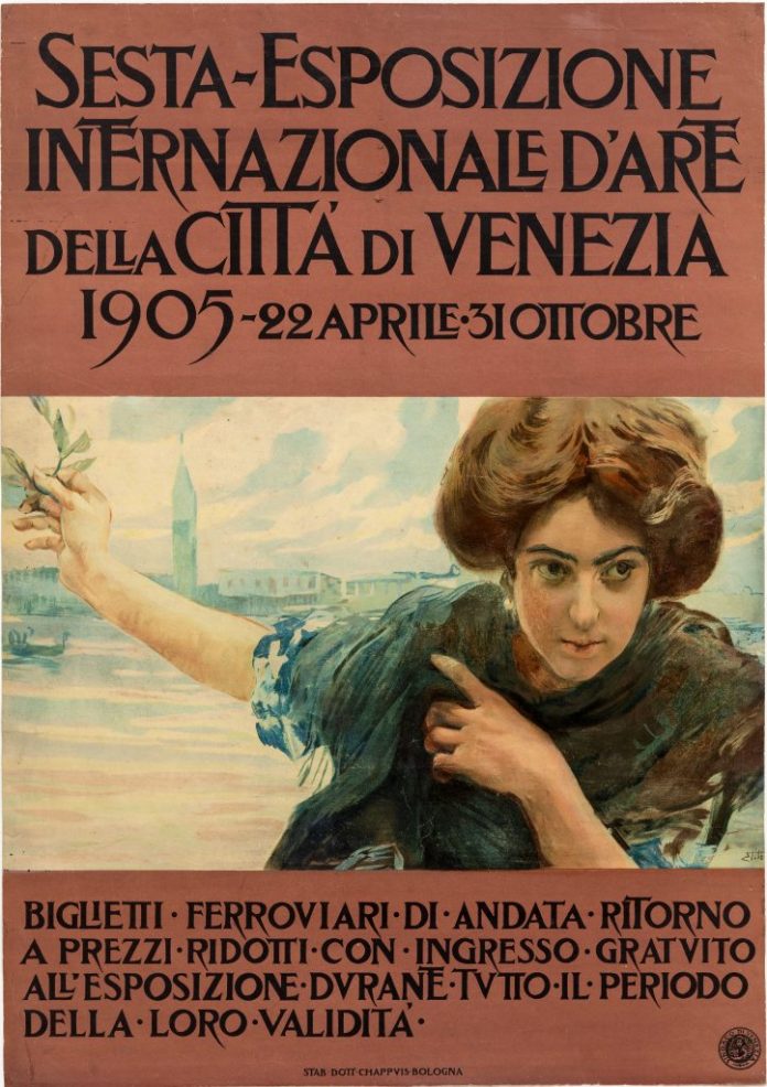 Tra la fine dell’Ottocento e la Prima guerra mondiale, i manifesti, ancora fortemente legati a una sensibilità pittorica e influenzati dall’Art Nouveau, vengono affidati ad artisti come Augusto Sezanne — autore anche del celebre leone “moeca” — insieme a Ettore Tito e Adolfo De Carolis. Fino al 1948 è la città stessa — con i suoi simboli e luoghi emblematici — a dominare l’immaginario dei manifesti: la Biennale di Venezia si racconta attraverso le bellezze urbane, mentre Venezia, a sua volta, costruisce un’immagine rinnovata, moderna e cosmopolita. Tra il 1922 e il 1950 si afferma inoltre il sistema dei concorsi, coinvolgendo importanti cartellonisti come Dudovich, Del Giudice e Lenhart, mentre alla fine degli anni Quaranta l’attenzione grafica inizia a spostarsi progressivamente sulle singole esposizioni.