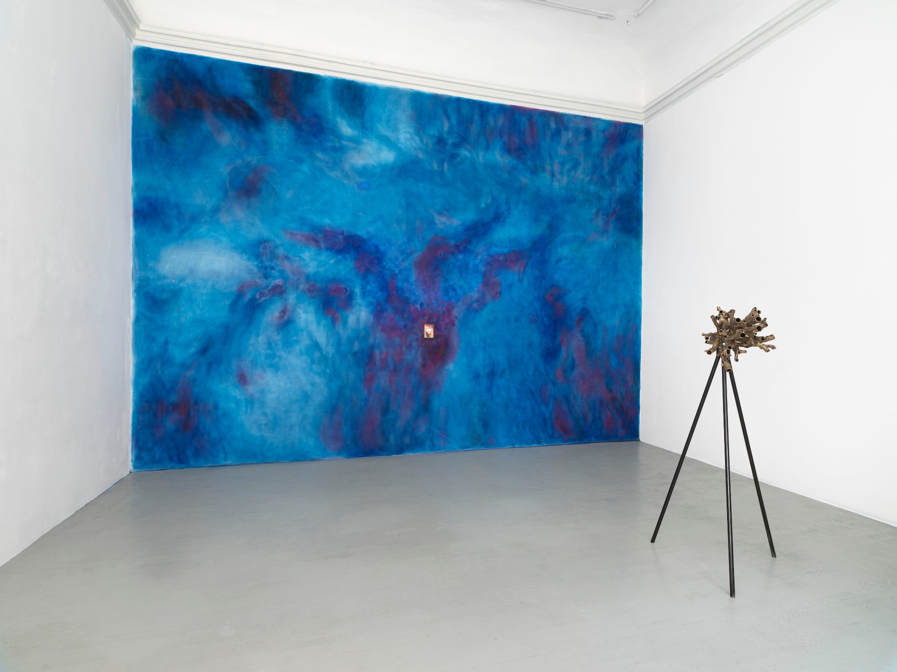 Già dall’inizio del percorso espositivo ci si sente avvolti da una nebulosa che ricorda la visione di un classico cielo blu, di quelli che fanno da sfondo alle pale medioevali ma in versione parietale, come la scena di un set cinematografico di Michel Gondry. Al centro, una piccola miniatura, delle dimensioni di un codex, ritrae Pizan nel suo studio, nella sua assorta solitudine. Poco distante, una sorta di cannocchiale, una scultura in ottone coralliforme invita a una visione del mondo polimorfica.