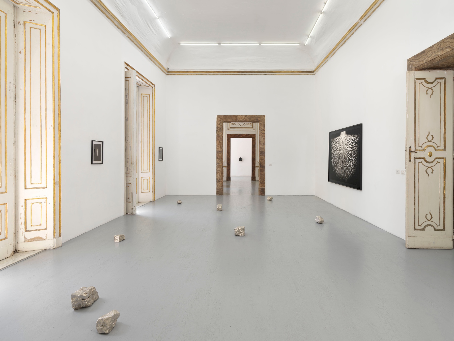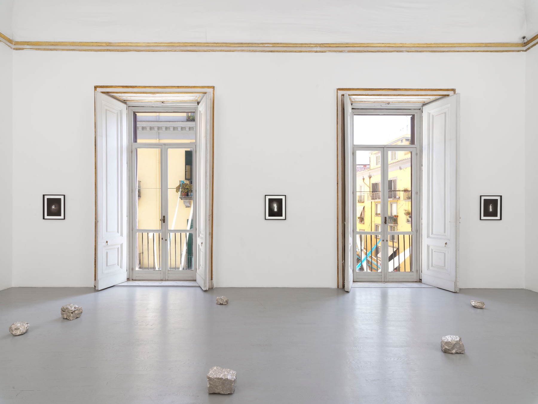 L’avvenimento, a cui il visitatore è invitato, è quello di una pioggia di stelle, un momento primordiale che, a differenza della nebulosa, viene contenuto dalla cornice come se fosse visto dall’interno di una finestra, in questo modo attivando un processo di reaction a cascata mentale che perdura in tutta la mostra. A testimoniarlo sono le nove pietre rivestite in nichel, disposte su tutta la sala come resti archeologici, che conservano il nome delle donne forti, fondamenta della città: Camilla, Caterina, Semiramide, Medea, Elena, Didone, Cassandra, Griselda e Pentisilea.