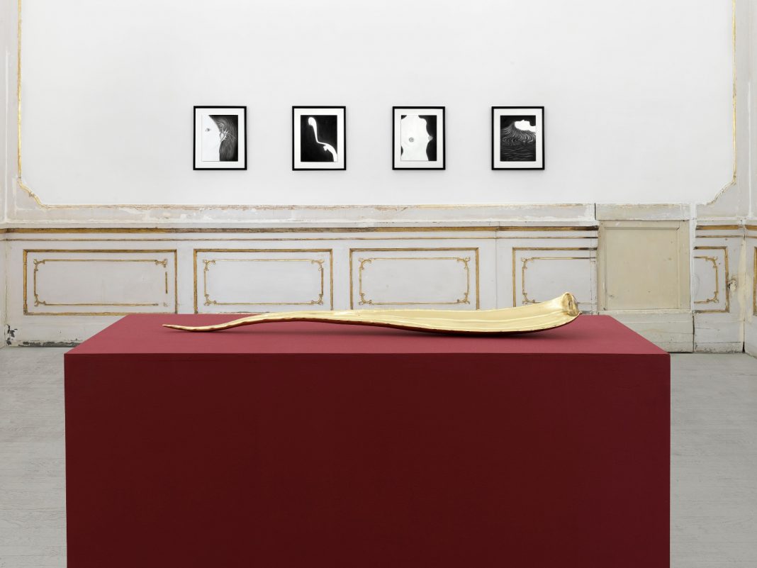 Un grande faro immerso nel tepore di un giallo radiante sembra voler illuminare le sale successive in una diagonale prospettica che bagna idealmente di luce prima una grande foglia di aloe, una scultura di ottone lucente che, grazie alla modularità delle sue spine, diventa nuovo strumento di misurazione per l’edificazione di una città futura; e poi una pietra di ossidiana in cui affondano, come uno Specchio, «Le venature, le interiora, il profondo, l’origine». C’è un alternarsi di zone di luci e ombre anche nel ciclo di disegni Siamo il passato oscuro del mondo, che trova un’eco nella letteratura femminista di Pizan ma che Bisesti riesce a far emergere nel presente, come un messaggio segreto da tramandare, nel tempo.