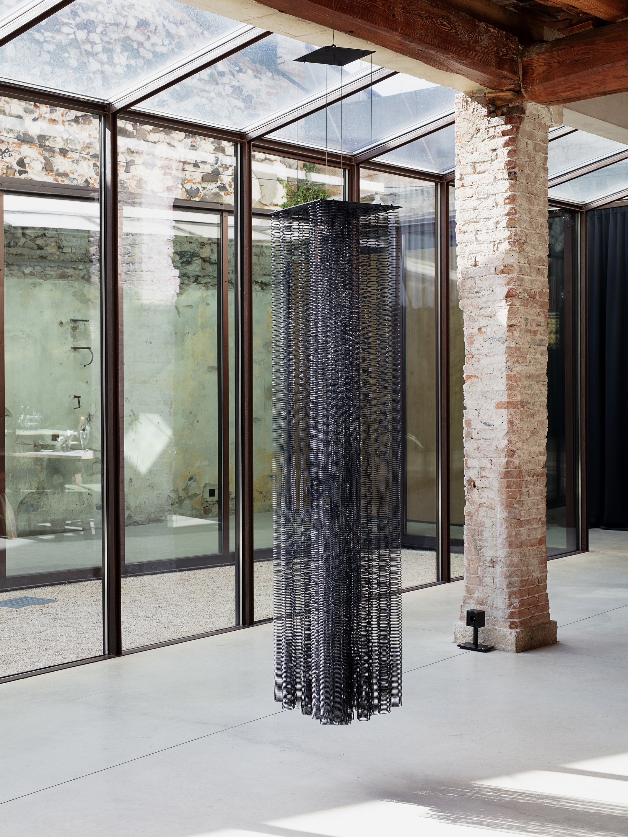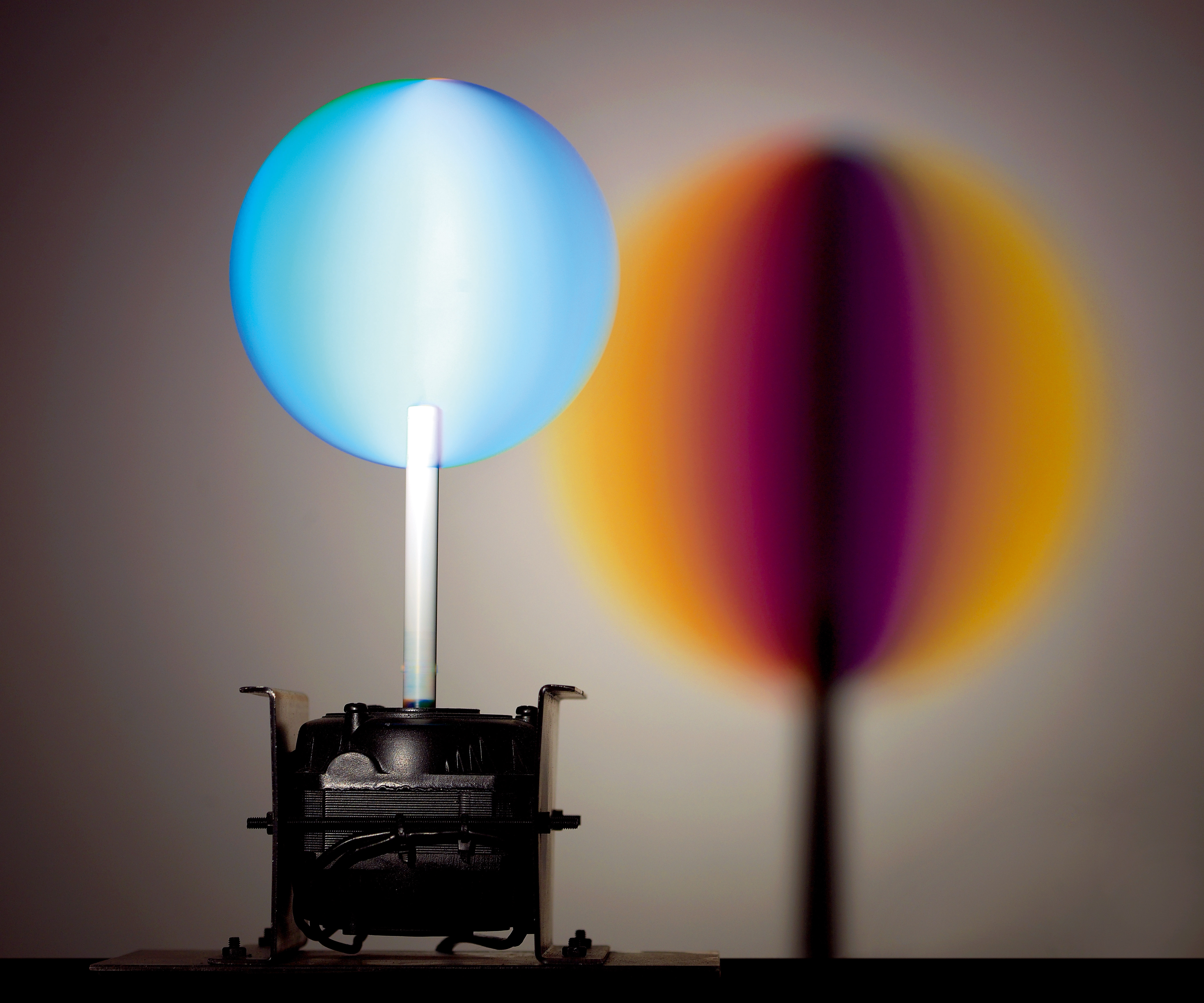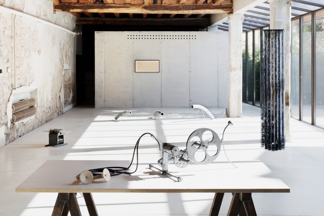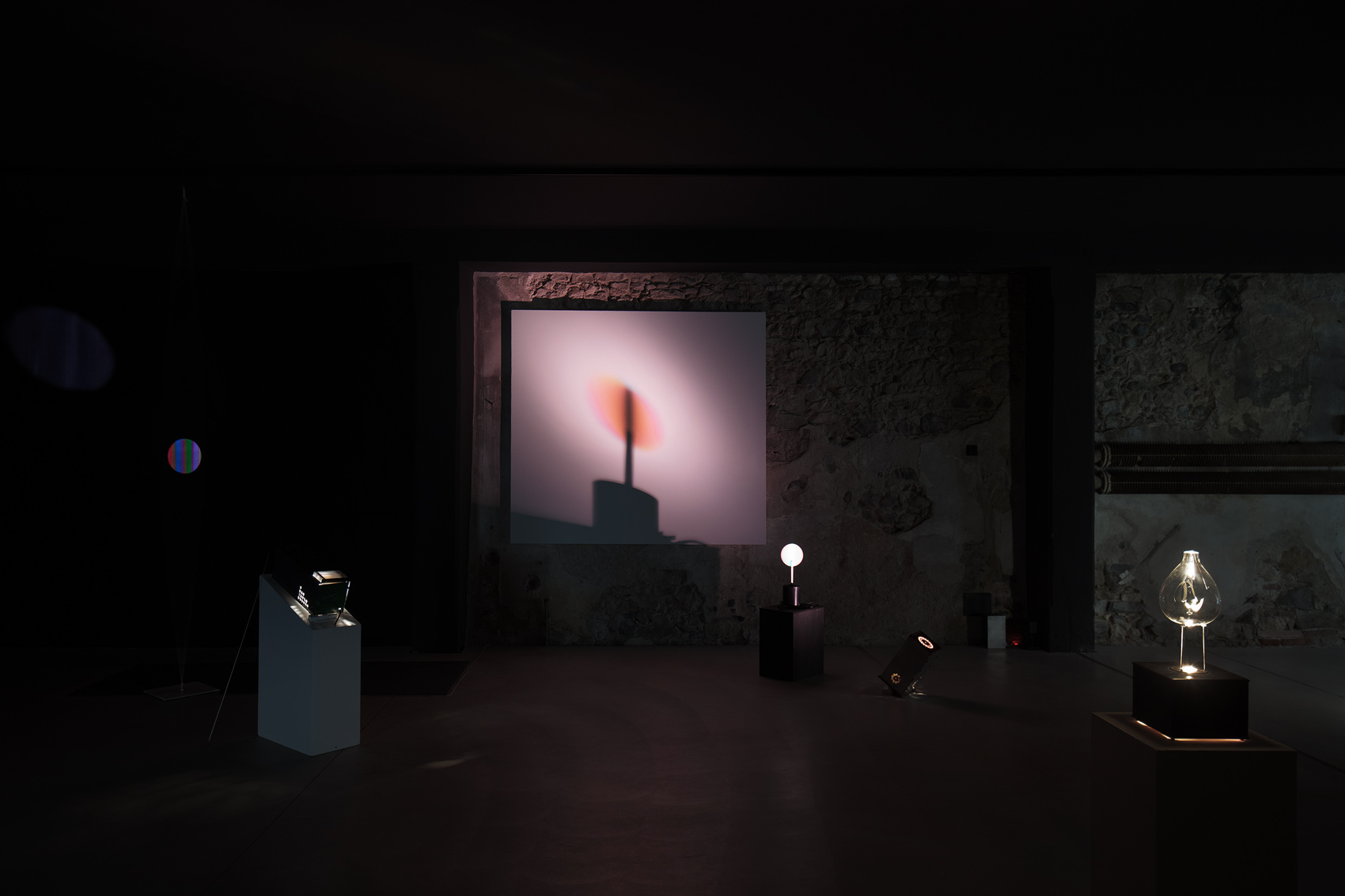 Immergiamoci ora all’interno dello spazio espositivo dove innumerevoli opere provenienti dall’Archivio Pietro Fogliati sono collocate nella penombra della galleria. L’attenzione dell’osservatore non è infatti rivolta ai vari e peculiari strumenti meccanici, ma verso il prodotto del loro gioco luminoso, che costituisce la vera opera d’arte, o meglio, ciò che Fogliati chiamava “spazi immateriali fantastici”. La protagonista della prima parte espositiva è infatti la luce, che anima tutte le opere dell’artista, come in Reale virtuale, 1993, a creare una scultura immateriale data da un riflesso luminoso sulle pareti di un’ampolla e in Luce solida, 1971 che realizza una vera e propria scultura di luce.