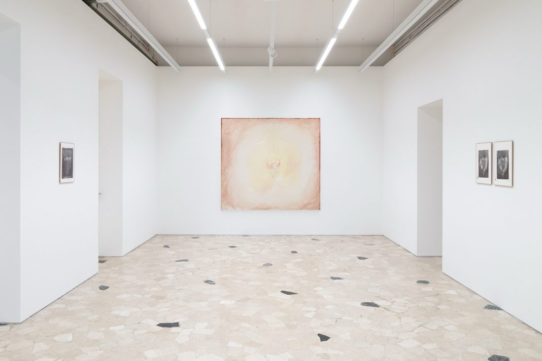 A seguire, ventisei fogli di cotone ci introducono alla palette e alle dolci atmosfere dell’artista georgiana: sono frammenti di cielo, tracce di nuvole, addensamenti di nebbia che si fanno colore sulla superficie ruvida. Gli azzurri siderali e il trattamento delicato del pigmento che qui ci accolgono si ritrovano poi nelle tele più ampie dell’artista: cieli tersi, uccellini leggiadri, una grossa orchidea e globi luminosi si susseguono nelle opere esposte. Come scrive la curatrice Marta Papini: «Kapanadze gioca con gli elementi e li rende permeabili, evanescenti. Confonde l’aria con la terra, il fuoco con l’acqua, guidandoci in un mondo antico in cui tutto era uno».