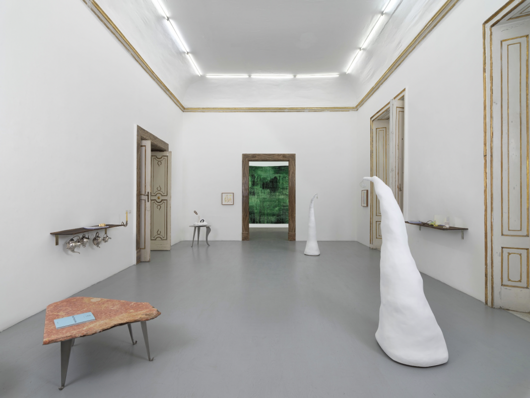 In Toluca/2903 (tributaries), il busto di una figura nobile di porcellana, incorniciata come uno specchio che affonda nell’oblio, guarda dal basso una scultura indigena, fiera e altera nelle sue forme stilizzate, rappresentante una forma divina protettrice della famiglia. Di notevoli dimensioni è A Moss Tapestry, letteralmente un arazzo di muschio, il cui verde della pianta di eucalipto, impresso nella trama di seta e lana, funge da “archivio di respirazione” come suggerisce il titolo. L’eucalipto ricorre anche nella scultura Jalapa/208 (tributaries). Su un legno di eucalipto affumicato, un elemento grigio ricorda, per la decorazione barocca, una parte di una scultura di Villa Pignatelli. Un’altra struttura bianca riprende le forme di un bruciatore di incenso, oggetto utilizzato dalla comunità Xico e che ricorda il vulcano Popocatèpetl, che in lingua nahuati vuol dire “montagna che emette fumo di continuo”, ma che qui, trova affinità col Vesuvio napoletano.