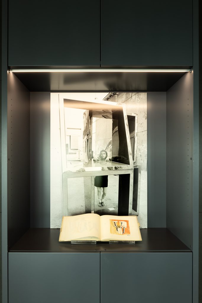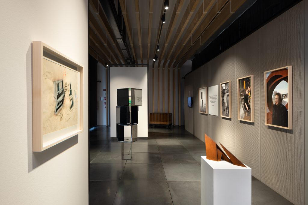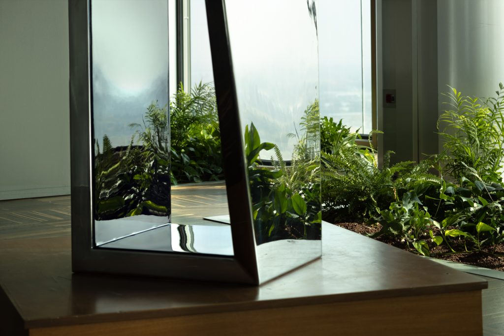 Non a caso, il cuore dell’esposizione è rappresentato da due sculture iconiche : Virgo Rectangle Twist e Prisms I. Entrambe in acciaio inox lucido, entrambe parte del patrimonio artistico del Gruppo Unipol, la loro superficie specchiante non è solo materia, ma un metaforico giunto di fusione che oltre a riflettere – e far riflettere – gioca con i vuoti e i pieni, tenendo insieme ciò che è dentro e ciò che è fuori. L’opera di Beverly Peppers è infatti spazio di collegamento, punto di contatto, per usare le parole stesse dell’artista: Connective Art.