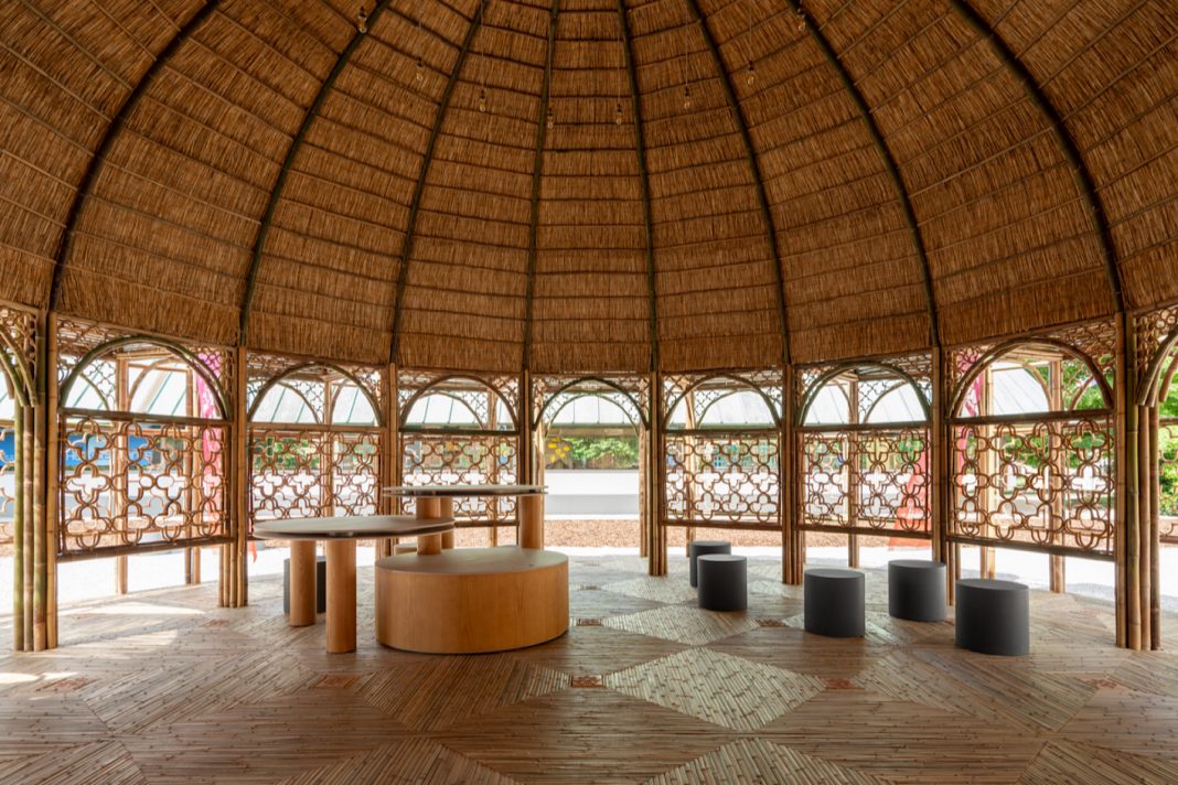 Proprio qui, nel cuore dei giardini, sorge ora una struttura temporanea, ma dalle implicazioni profonde: si tratta del cosiddetto Community Centre, progettato dall’architetta pakistana Yasmeen Lari, pioniera della “de-architettura”, ovvero di un’idea costruttiva fondata su sostenibilità radicale, tecniche vernacolari e impatto minimo. Lari —che lavora da anni con la Heritage Foundation of Pakistan, organizzazione da lei stessa co-fondata— ha ideato per il Qatar una splendida cupola realizzata in bambù e fronde di palma, ispirata alle strutture costruite per offrire rifugio alle vittime di terremoti e alluvioni in Pakistan. Si tratta, perciò, di uno spazio che, non solo nella forma, ma anche nella tecnica e nel contesto di origine, trova un imprendisicibile legame con il concetto di ospitalità e di apertura verso il prossimo.