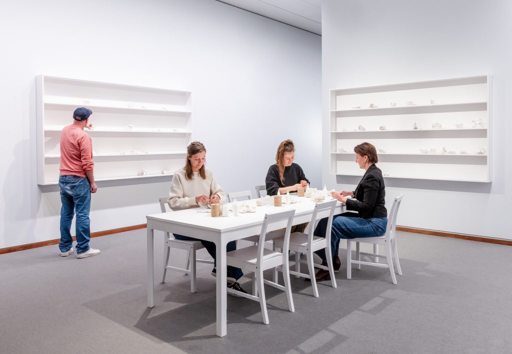 Altro elemento fondante della sua ricerca è infatti il coinvolgimento del pubblico, al quale è riservato sempre un ruolo attivo. Stringersi la mano attraverso una tela forata, piantare chiodi per creare un quadro, giocare con una scacchiera dai pezzi completamente bianchi: sono tutte azioni che veniamo invitati, anche in mostra, a portare avanti concretamente.