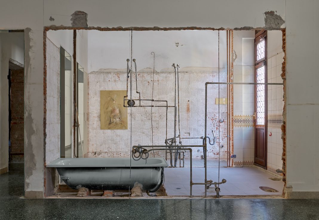 Di costruzione quattrocentesca, l’immobile è stato a lungo lo studio del pittore Ettore Tito e, per l’esposizione della Astakhishvili, esso è stato modificato e livello strutturale, secondo l’approccio tipico dell’artista, che potremmo definire d’intervento totale. Nuove pareti dove prima non c’erano, spazi vuoti dove i muri dividevano lo spazio, un bagno ampliato che diventa parte del percorso espositivo e tutta una serie di specchi ad amplificare lo spazio: l’edificio, con la progettazione della Astakhishvili diventa un diaframma che si allarga e che si contrae.