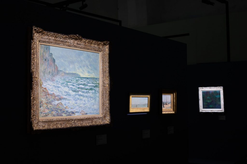 La mostra si articola in cinque sezioni tematiche: Fattoria Saint-Siméon; In riva al mare, villeggiatura; Lavoro; Terra normanna; Lungo la Senna. Il percorso evidenzia la centralità della Normandia come laboratorio della pittura en plein air, rivoluzionaria per tecnica e visione. Spiagge, falesie, porti e campagne diventano luoghi di sperimentazione artistica, dove la luce e l’atmosfera sono protagoniste. Una struttura non soltanto narrativa: è infatti una progressiva immersione nella fisica della natura che diventa fisica della pittura, secondo la felice espressione del curatore Alain Tapié. Tra le opere emblematiche figurano Il mare a Fécamp di Monet, Passeggiata al porto di Fécamp di Berthe Morisot, Tramonto, veduta di Guernsey di Renoir e Marina, mare grosso di Courbet: dipinti che testimoniano la ricerca sull’istante, sulla vibrazione atmosferica e sulla potenza della natura. Con Marina, mare grosso, Courbet anticipa la tensione impressionista cogliendo il momento in cui la natura si fa evento in divenire. Dufy, ne Il bacino del re a Le Havre, introduce una sensibilità già fauve, mentre Le Sidaner, in Barche a vela sul mare in lontananza, esplora la dimensione contemplativa attraverso tonalità soffuse.