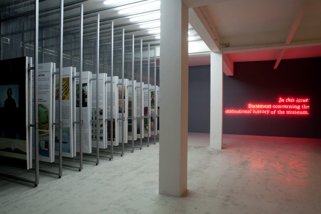 Il percorso si conclude con un neon rosso, Act III: Molding (2012) che recita la frase «In this issue: Statement concerning the institutional history of the museum», accompagnato dal grande archivio consultabile In this issue. Act I: Painting (2011). Ecco che le opere ci ribadiscono ancora una volta l’attitudine internazionale della Fondazione Merz nello sfidare la musealizzazione, considerata come una pietra tombale sulla storia e sui contenuti.