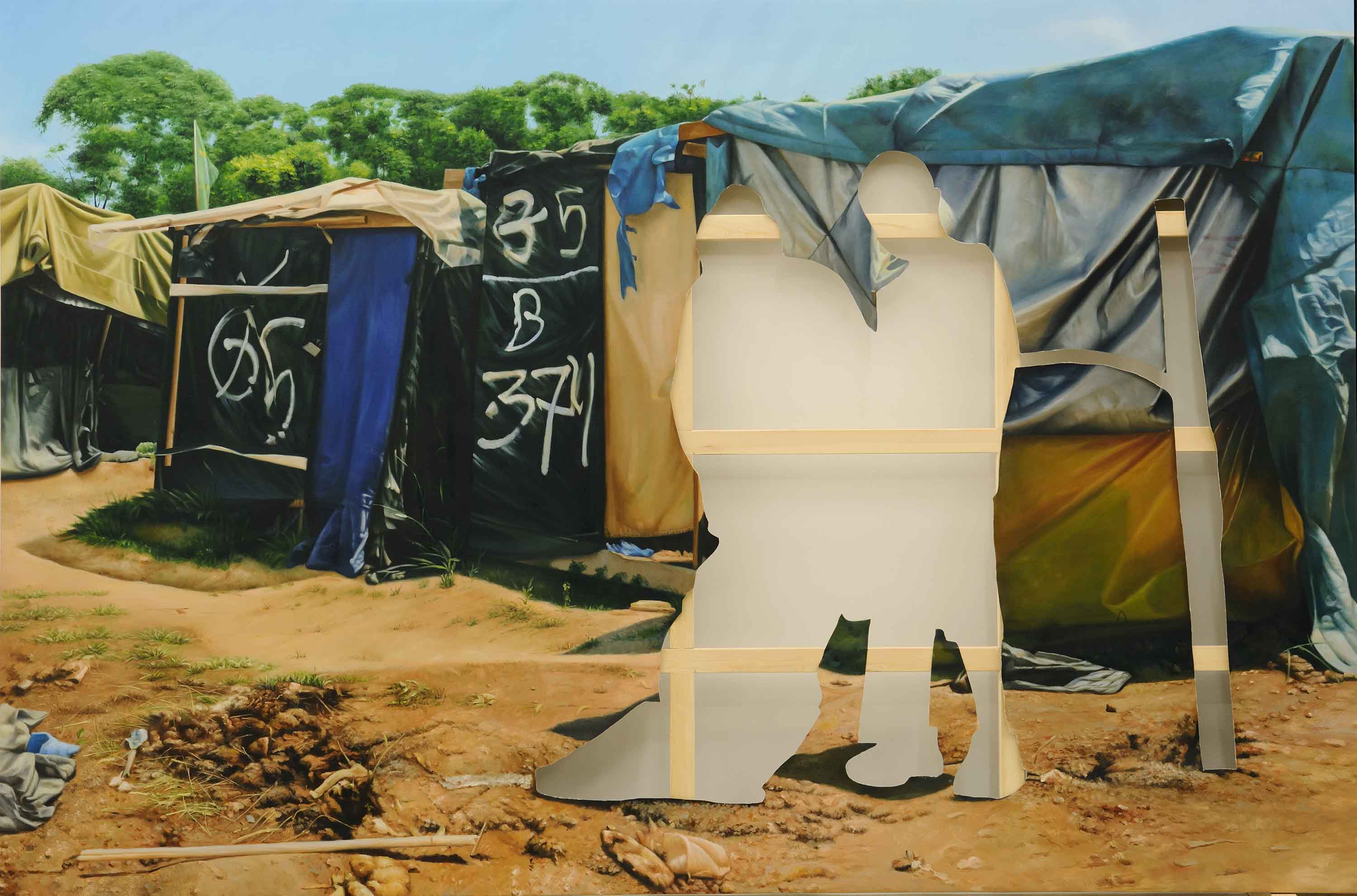La mostra a Torino è una tappa speciale in questo percorso. Tra le sale, il museo stesso è in fase di costruzione o smontaggio, con pareti che accolgono i vuoti lasciati dalle figure umane ritagliate che animano l’opera Acampamento Vila Nova Palestina (2017). Un elemento visivo che trasmette dal primo sguardo il senso di precarietà ed esilio che è comune alla condizione dei rifugiati in tutto il mondo.