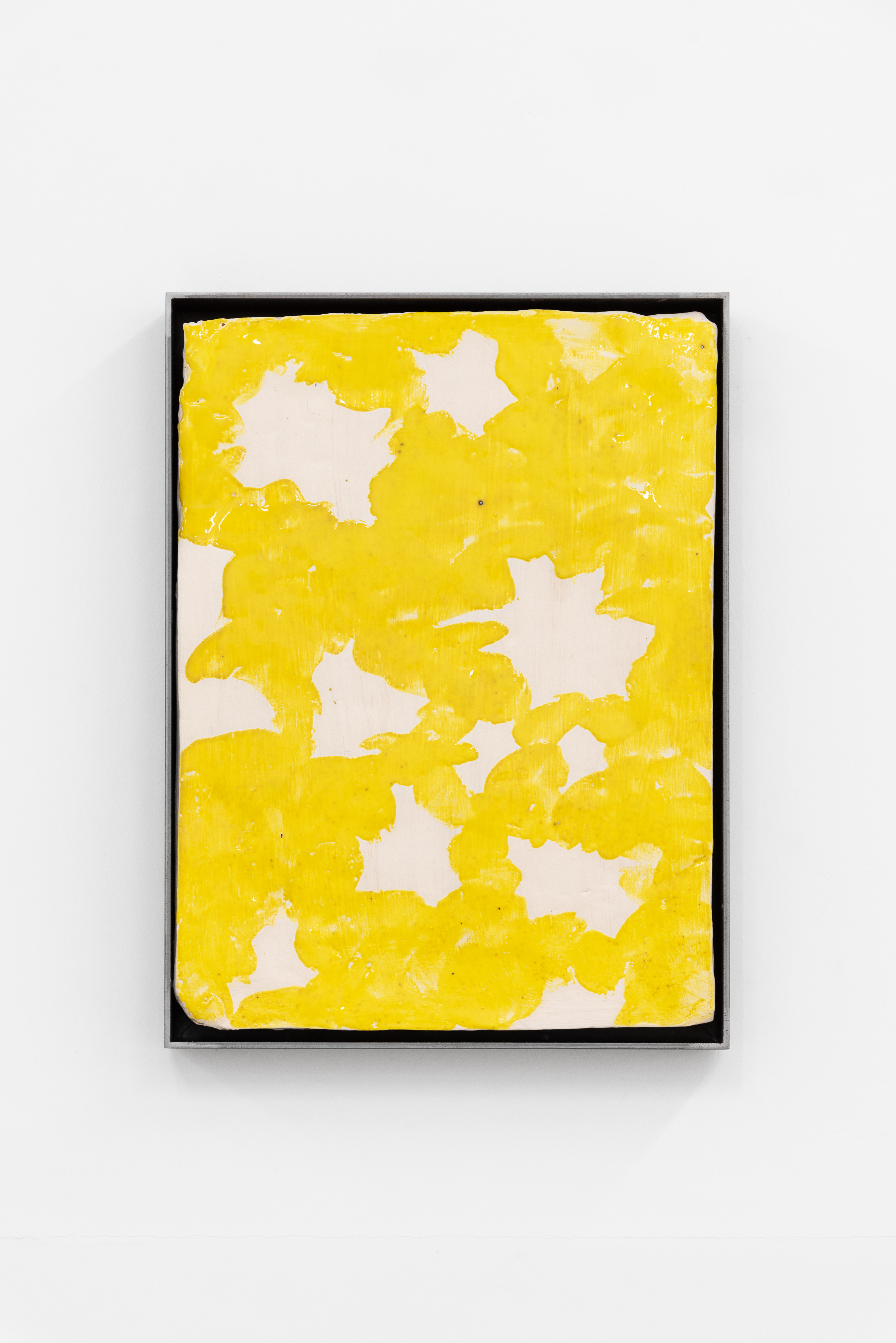 In particolare, in queste ultime opere, l’immersione è ancora più evidente, i rettangoli si aprono in fessure gialle e alludono a ulteriori dinamici spazi, il dipinto è tutto ciò che si scorge da quella finestra, un luogo trasparente di qualcosa che rimane vivace quanto opaco. È una questione che sfiora la pittura nel suo “senso architettonico”, ogni elemento, rispondendo alla stessa funzione di curiosità, è essenziale nella vicinanza dei toni e nella coesione delle forme. Solo ora questa pittura dalla figurazione incerta acquisisce un senso, perché in realtà quanto si intende fissare è piuttosto la trasformazione di una composizione che ha in mente, è lì nell’atto del disfarsi, colta nel punto d’equilibrio. Ecco il perché di piccoli lampi gialli di questa sua ultima produzione, rappresentano la fissazione di un determinato momento che sporge e chiede di esistere verso l’esterno: si tratta di svariate visioni che arrivano subito dopo lo stato di dormiveglia che vengono colte sulla tela, altrimenti fuoriescono nella loro forma più tangibile attraverso la ceramica, il bronzo e il legno.