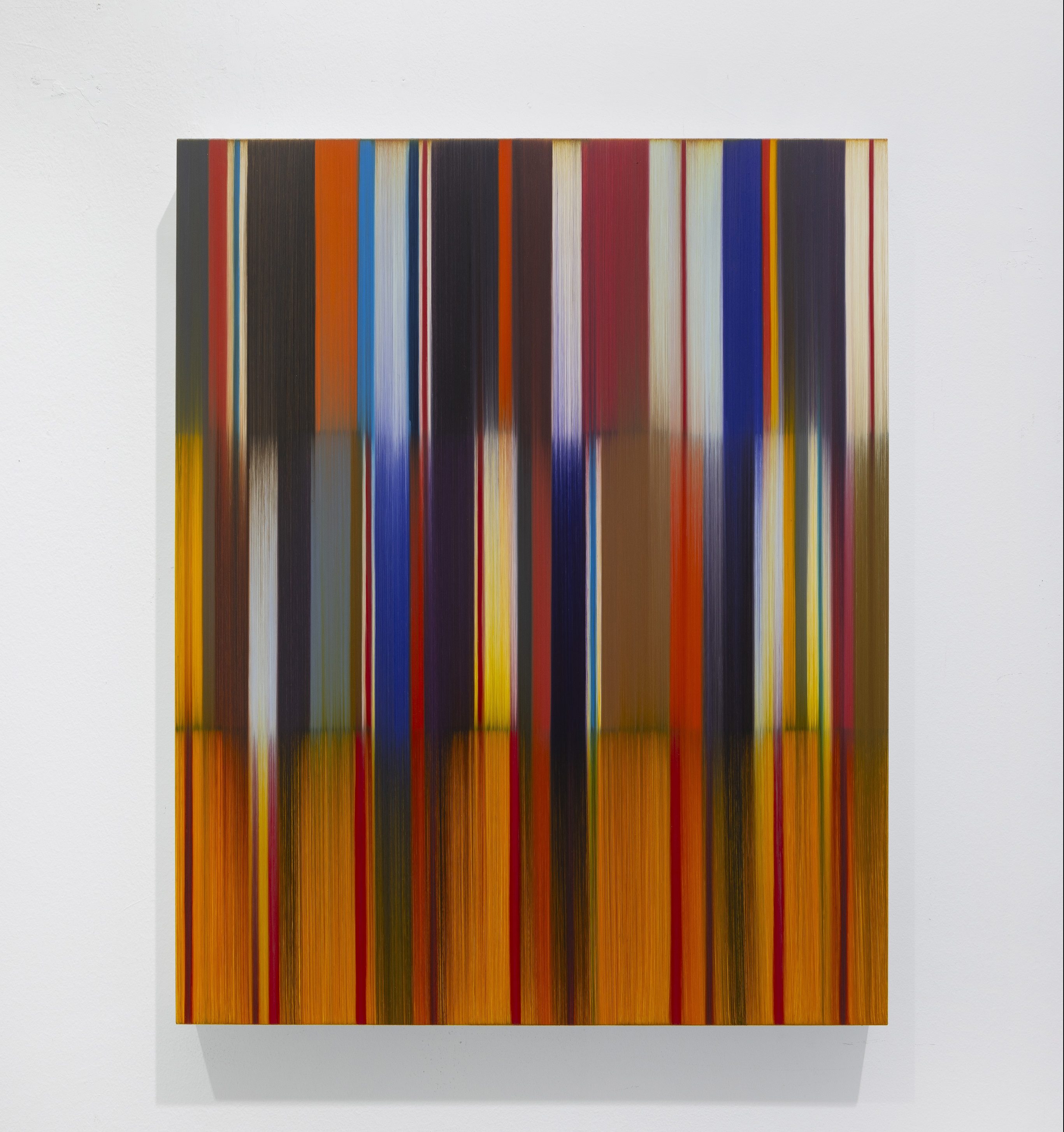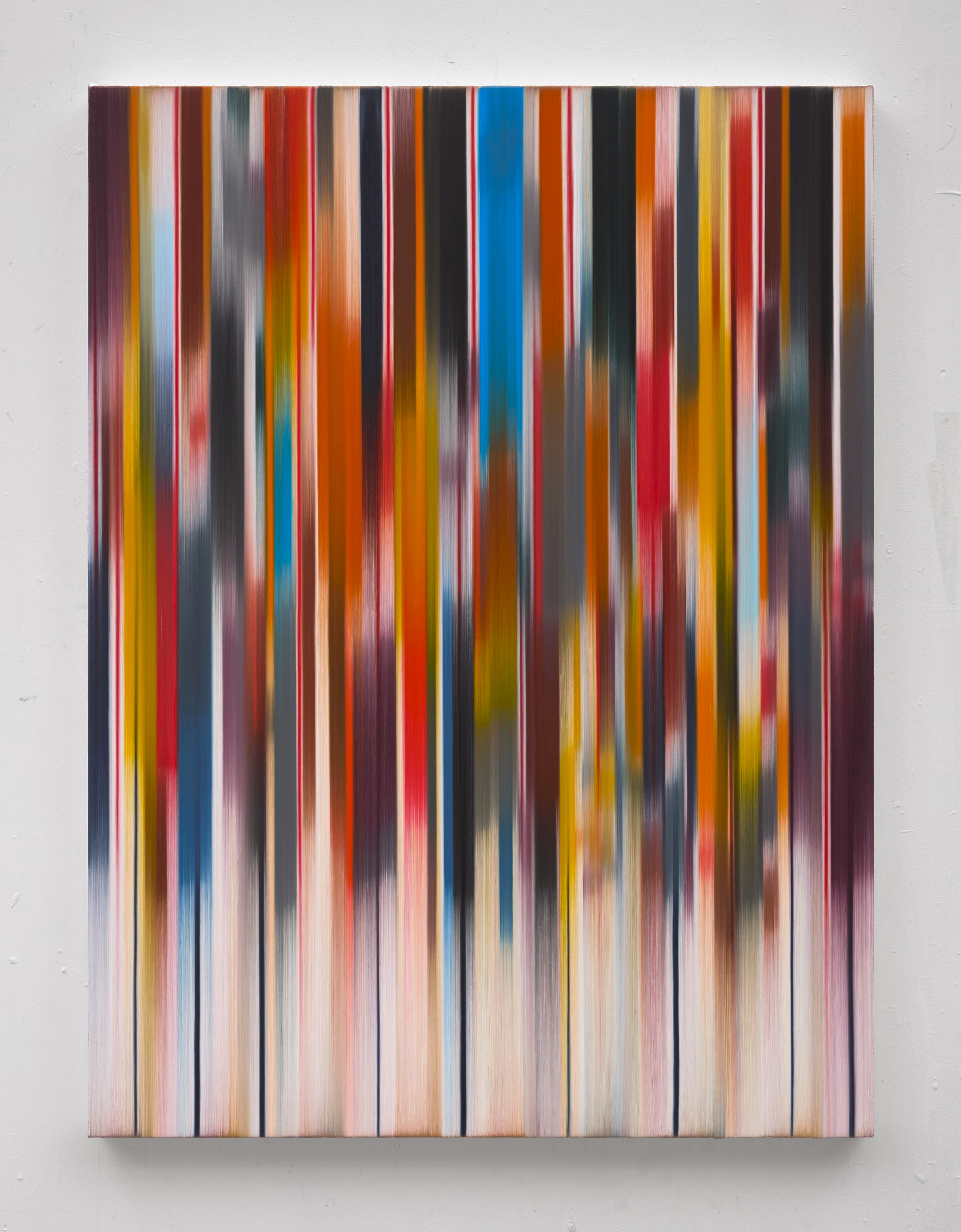 Caro gli è sin dall’inizio l’impeto di un rapporto che lo conduce a un reiterato confronto con la scienza. Prima, mediante visioni microscopiche della fisiologia umana, con cui arrivava ad armonizzare sulla tela la struttura del sangue, batteri e movimenti spermatici. Ora, invece, nell’insieme di un corpus di dipinti che recuperano il gusto minimalista di una stesura del colore formalmente astratta e apparentemente innocua. E scrive bene Andrew Cross, poiché quanto è in gioco è qualcosa di «Notevolmente ottico e percettivo». A ciò che era infinitamente piccolo, o quelle parti dell’universo corporeo che all’occhio sfuggono, si sostituisce nel complesso una nuova sperimentazione fatta di «Bande verticali in blocchi di colore che cambiano rapidamente».