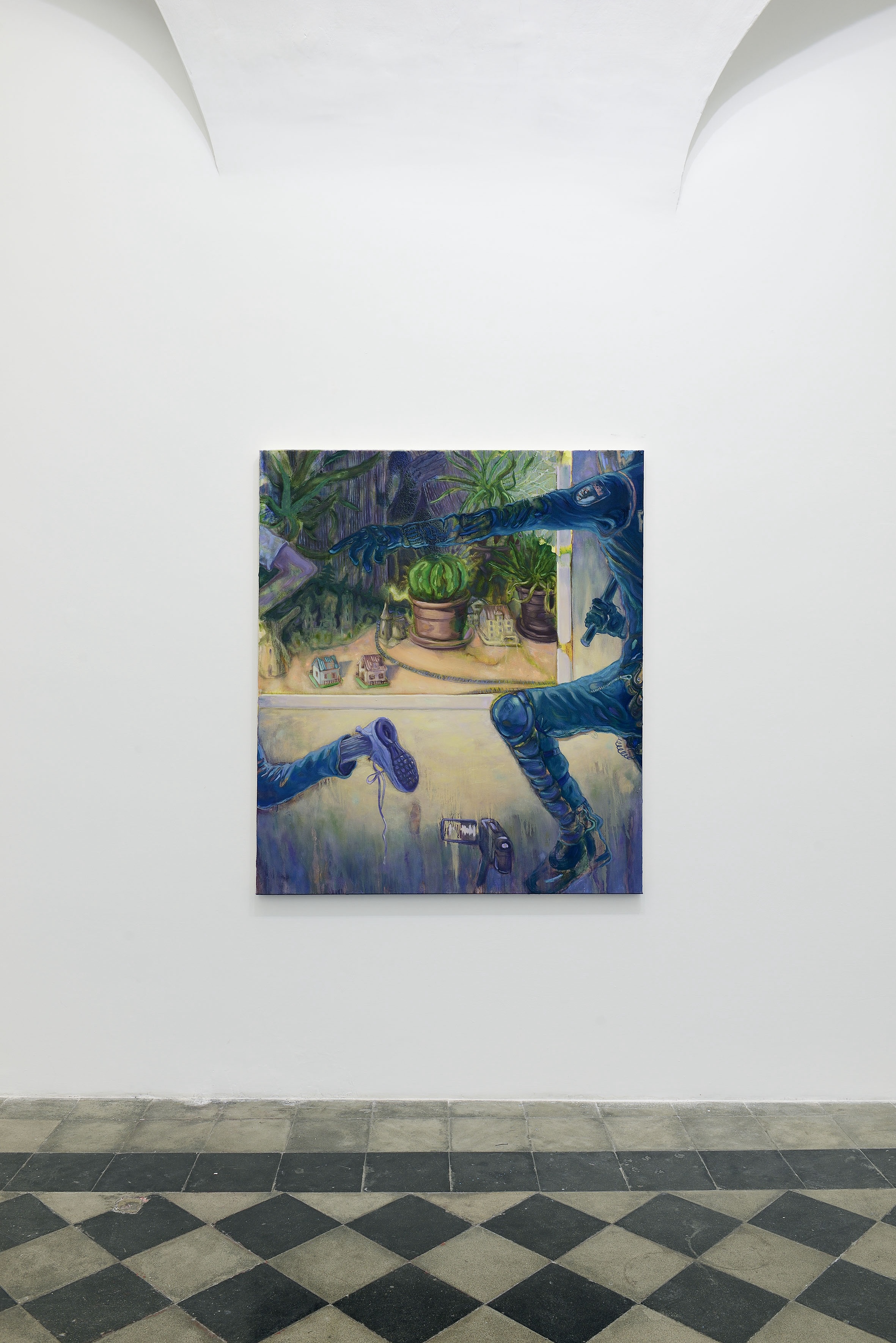 Al centro della sala si impone La forza fragile (acquerello e olio su tela, 450 × 200 cm), opera site specific divisa in tre pannelli. A sinistra, un poliziotto con casco antisommossa; a destra, tre bambini e un corpo maschile nudo; al centro, la testa dell’uomo appare dietro un albero, isolata e sospesa. La scena si svolge in un fitto bosco: due tronchi scandiscono la narrazione orizzontale mentre la luce filtra tra le foglie, generando un’atmosfera rarefatta e quasi irreale.