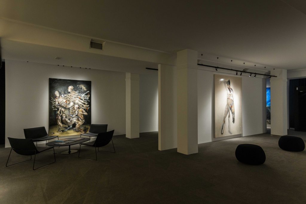 Labirinti di carne, pozze di liquido amniotico, danze macabre e corpi che si sciolgono e contorcono in un inferno dalle sfumature dantesche: sono questi i protagonisti di quella che Sergio Padovani (Modena, 1972) definisce la sua «pittura respingente », oggi in mostra presso la sede di Fondazione THE BANK, a Bassano del Grappa. La Fondazione, attraverso un ricco programma espositivo, si propone di sostenere attivamente la pittura contemporanea, in particolare con un occhio di riguardo per la produzione figurativa italiana.