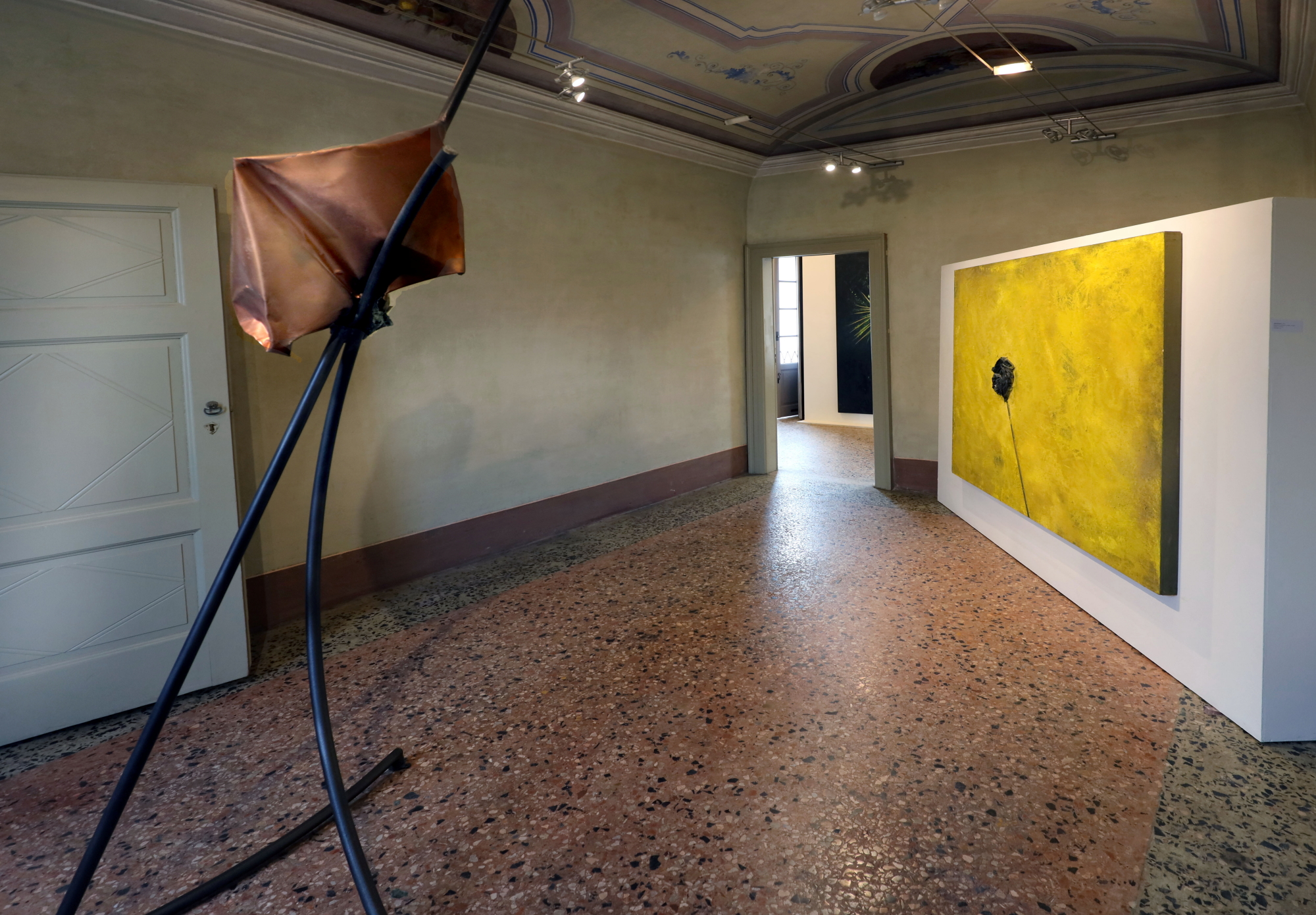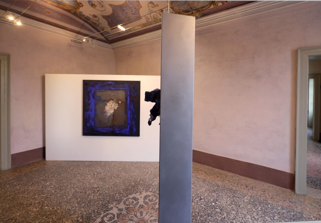La mostra allestita a Villa Brivio comprende circa venti grandi opere che mostrano, tra pitture e sculture, il percorso dell’artista dal 1986 ad oggi. Come sottolinea Flaminio Gualdoni in apertura di catalogo, Claudio Palmieri incarna della sua generazione «il versante di una forte predilezione per il fare», evidente in tutta la sua produzione dagli esordi fino ai tempi più recenti, in cui il rapporto con la materia è predominante nell’ideazione e realizzazione dell’opera. Le solide conoscenze tecniche consentono a Palmieri di passare agilmente dalla pittura alla scultura, attraverso l’utilizzo di materiali diversificati, appartenenti sia a linguaggi più tradizionali sia a quelli radicalmente innovativi.