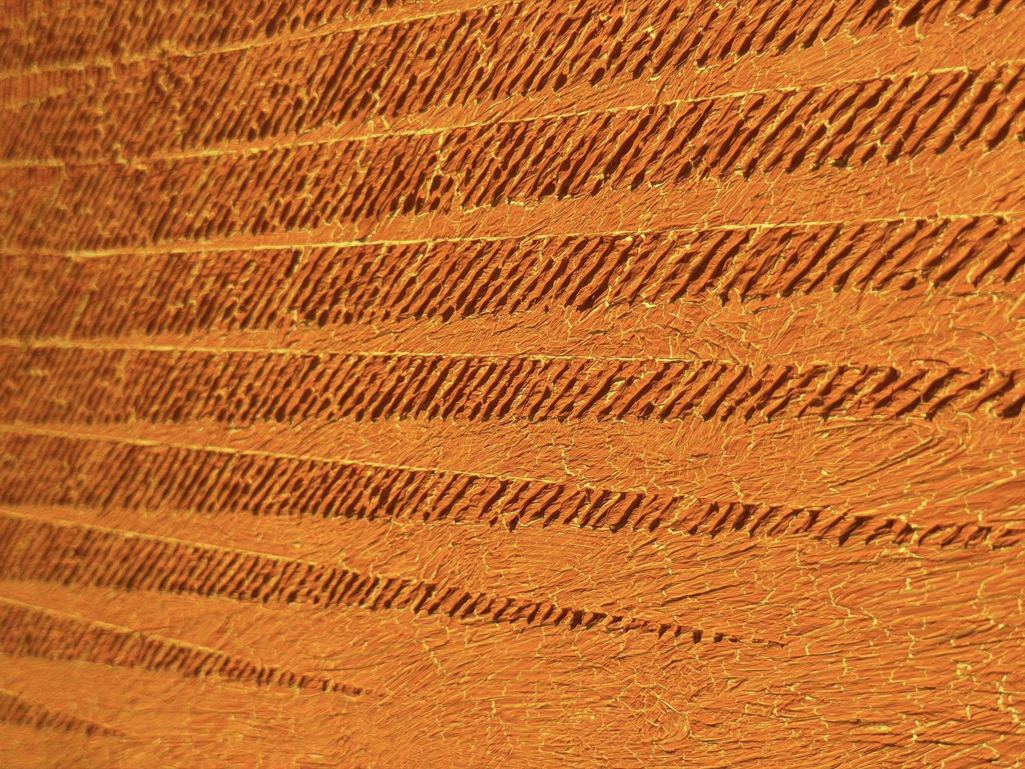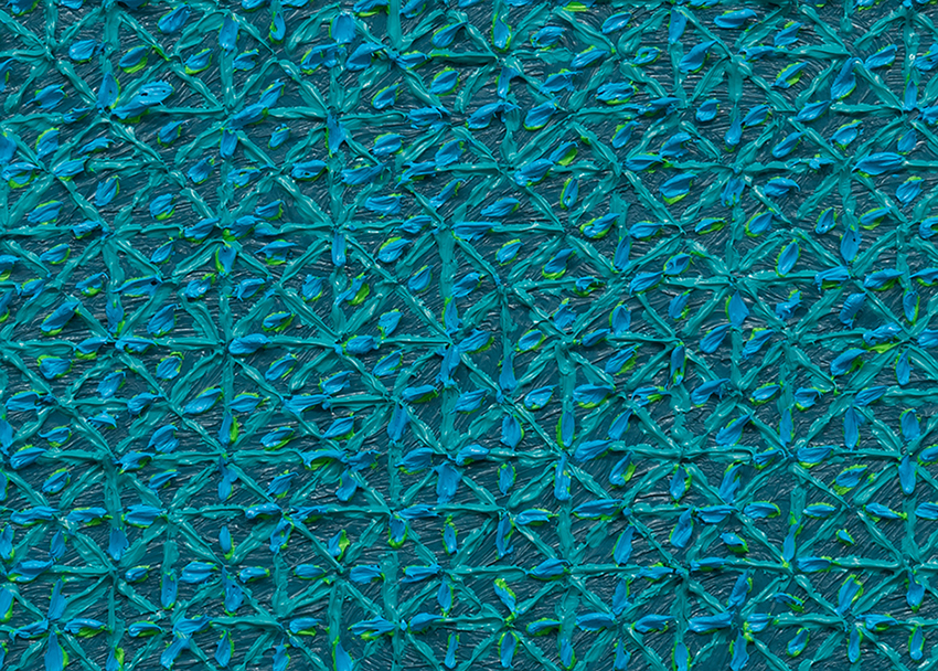 Mentre la materia pittorica si offre nella sua anatomia, il colore si destruttura in unità modulari. Vere e proprie creature embrionali che vivono di una propria individualità, pur attivandosi in un’interdipendenza tra micro e macro attraverso le strutture di tratti e linee che contrappuntano il campo visivo del dipinto.