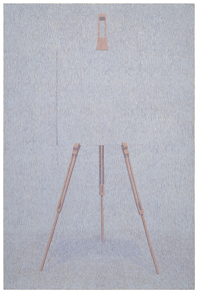 In Immagine sospesa o sospensione immaginata del 1980, la dimensione onirica, che già di per sé rimanda a Mimesis (la sequenza installativa proposta in quell’anno alla mostra Laboratorio Puglia curata da Mimmo Conenna, tra l’altro anche occasione in cui Gadaleta e Crispolti si conoscono segnando l’avvio di un profondo e longevo confronto), si infittisce con pennellate dai toni grigio pastello, che rendono ancora più riuscita l’illusione ottica di sovrapposizione tra sfondo e cavalletto in primo piano. La stessa intenzione di nobilitare gli attrezzi del dipingere ritorna in Tela-io, dove artefice e strumento si immedesimano l’uno nell’altro in una sorta di autoritratto in forma di dichiarazione di fedeltà alla pittura.