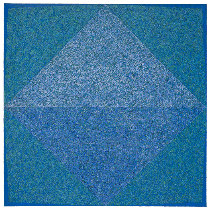 E se in Eccentrica concentrazione del 1988 questi micro-sistemi segnici si formalizzano in triangolari architetture disposte ad incastro in un arazzo pittorico, nella tessitura cromatica di Mare oltre dello stesso anno la serrata concentrazione di angoli acuti e punte sublima il triangolo in un’apparizione speculare, che tende a trasfigurarsi nella compenetrazione di echi e dissolvenze. I motivi decorativi generati dal capillare perpetuarsi di fibre materiche evocano anch’essi, in una frequenza di dejà vu, la tradizione pugliese – ma di matrice bizantineggiante – richiamando metaforicamente il senso dell’archetipo, simboleggiato dalle tracce che scandagliano le tele, sezionate dai segni a cui forse Gadaleta attribuisce un valore memoriale, e primordiale, di radice assoluta.