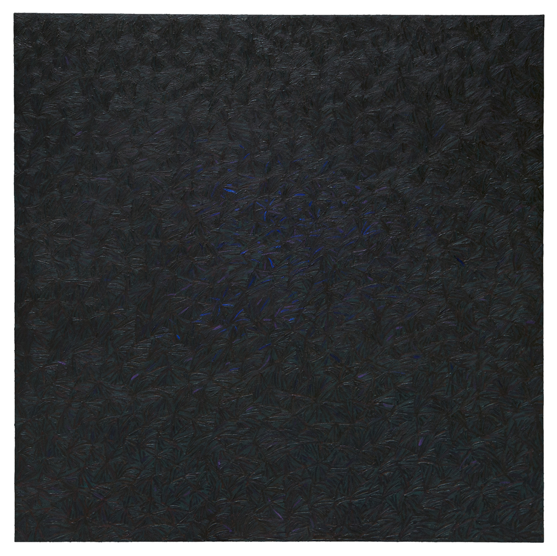 Ne è un esempio Per occhi che vibrano del 1985 che racchiude e trattiene, nell’impenetrabilità del nero apparente, una stringente dialettica di segni assimilabili a brulicanti organismi unicellulari organizzati in strutture molecolari, imbastendo una trama di pattern biologici. I riverberi cromatici entrano in complicità con la luce fino a innescare un rapporto di causa-effetto che interessa tutta la superficie del dipinto, da cui affiorano le cangianti iridescenze di una labradorite, entrando dapprima in empatia con lo spettatore per poi catalizzarne lo sguardo in uno stato di contemplatio.