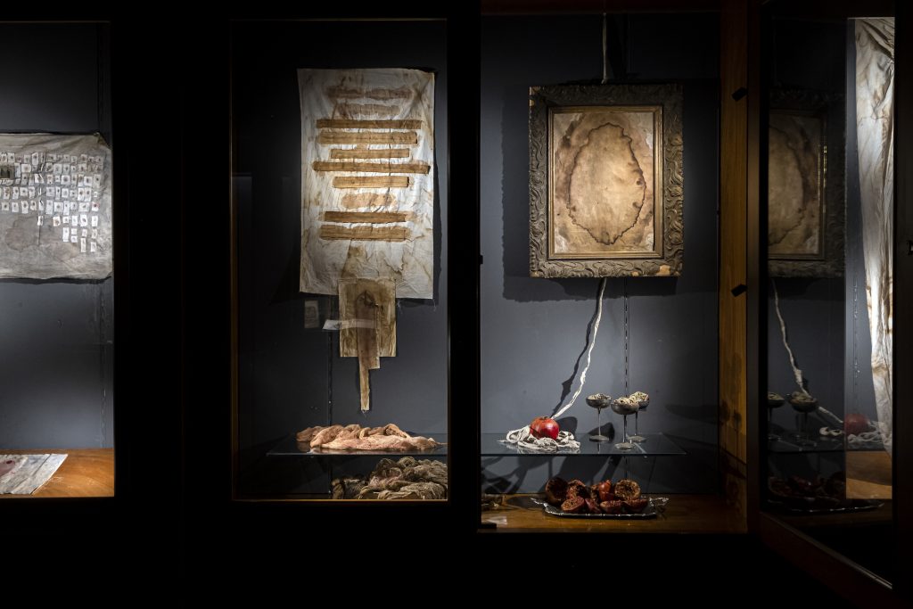 Tiziana Cera Rosco mostra una connessione sensuale con l’Orto, in un rapporto di rispetto e intimità pari a quello con il corpo femminile, che per l’artista diventa un ponte per connettersi alla vita, per valorizzarla anche dopo quella che sembra apparire come la morte, ma che continua sotto forma di altro. In questo modo le foglie secche, i fiori essiccati, alghe e melograni attaccati dalle muffe, aprono uno sguardo verso l’altro lato della vita, quello della conservazione e dalla trasformazione, alla rivalutazione della loro esistenza che non si è realmente interrotta.