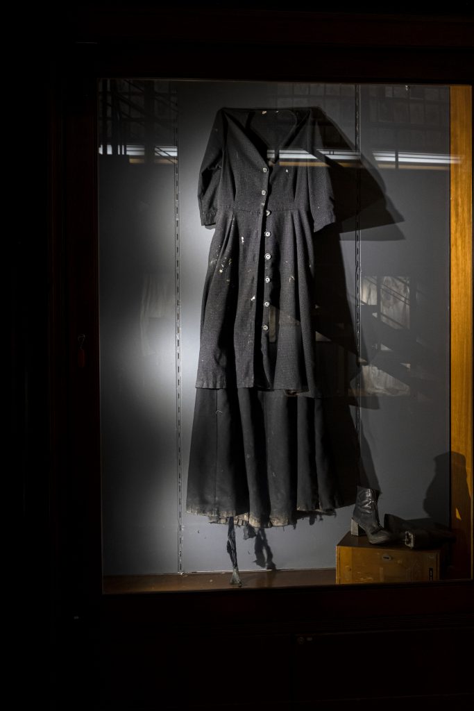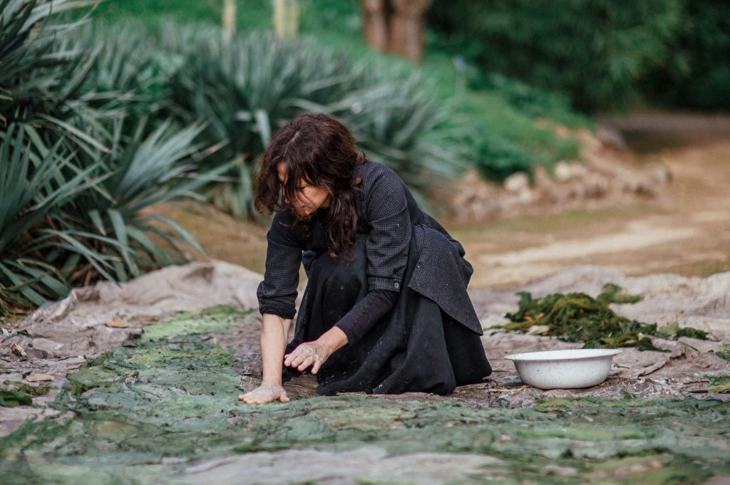 È possibile sentire l’artista passeggiare insieme a noi fra questi enormi erbari, vestita con lo stesso abito nero che l’ha accompagnata fra i vicoli alberati dell’Orto o sentire il suono delle sue lenzuola strizzate sulla roccia, dipinte con il colore delle alghe o con il materiale organico rintracciato sul posto, facendo attenzione verso l’ambiente e l’ecosostenibilità della propria arte. Le lenzuola e le garze impresse con l’acqua dello stagno, tramite le alghe raccolte o col succo dei melograni, diventano sudari sui quali le trame e le sfumature raccontano il tocco e la connessione dell’artista ai materiali usati e al luogo stesso, richiamando simbolicamente a una vita lenta distante dall’oggi, quella in cui il bucato veniva lavato sui bordi del fiume, fra le rocce e la natura, ma anche a dimensioni più carnali, della scoperta e della relazione con il proprio corpo, in un evidente approccio poetico da parte dell’artista.