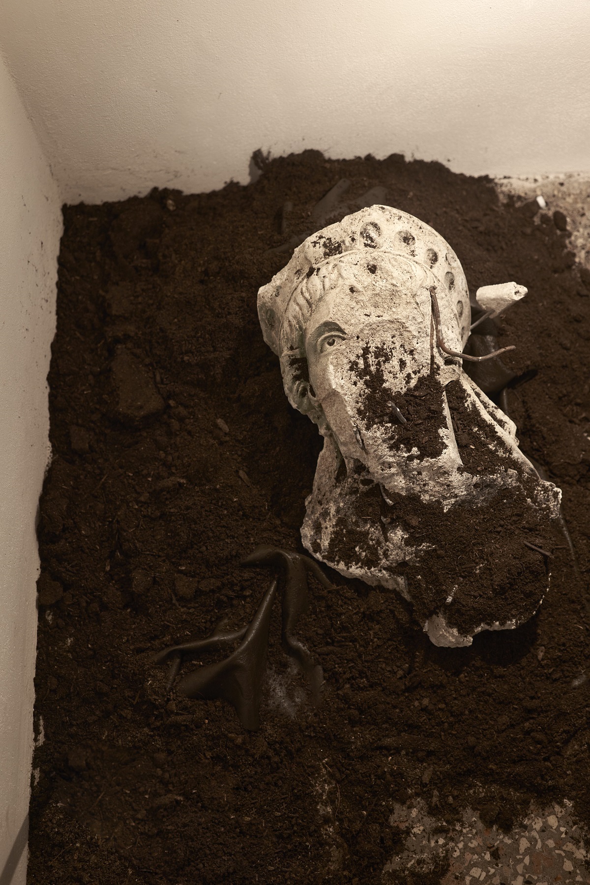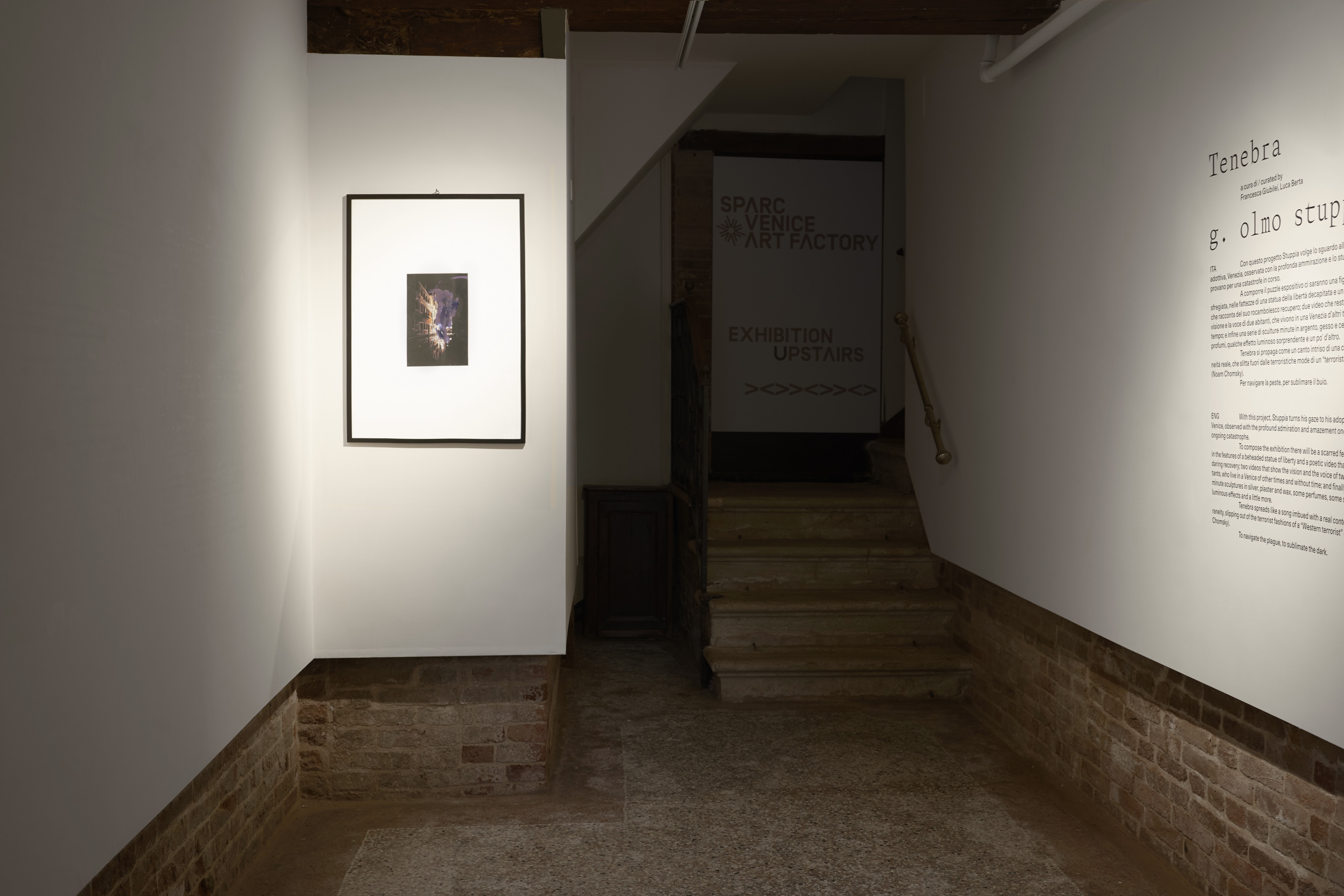 Nonostante sia personale, la mostra non è autobiografica. g. olmo stuppia ha strappato dalle tenebre personaggi, ruoli e simboli. La sala del piano terra contiene una breve introduzione alla mostra e una fotografia di un canale di Venezia, che è stata scattata nella solitudine del lockdown di marzo e su cui l’artista è intervenuto con del colore blu. Passando alla parte dell’esposizione che è quasi totalmente immersa nel buio, sulle scale è stata disposta la testa deteriorata di una statua della libertà disseppellita dall’artista in Sicilia, operazione documentata da un video proposto nella sala successiva. La simbologia della statua evoca il ritorno dell’Occidente ai suoi albori, non come imposizione, ma come scherno alla sorte: nonostante sia in rovina, la libertà come la statua, esiste ancora.