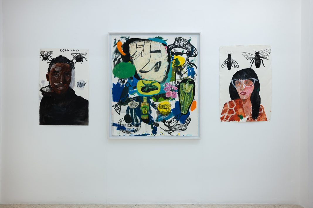 Le pareti della galleria appaiono come una costellazione di carte che vanno dal piccolo al grande formato, alcune meno recenti su fondo bianco, altre caratterizzate da colori più accesi e vivaci. Le opere su carta di Régis presenti in mostra hanno come filo conduttore il medium utilizzato: nonostante la ricorrenza dei soggetti– come volti, fiori, cibi, animali – ogni singola opera rappresenta un universo a sé. Ad alimentare il suo immaginario di riferimento contribuisce sicuramente il mercato di Ballarò, contesto dall’anima variopinta, popolare e multiculturale, nel quale si trova il suo studio palermitano. È proprio questa varietà ad attirare l’attenzione dell’artista: i vari soggetti scelti da Régis, infatti, portano con sé rumori, odori, sensazioni e la loro mera giustapposizione crea narrazioni ricche di contrasti e vitalità.