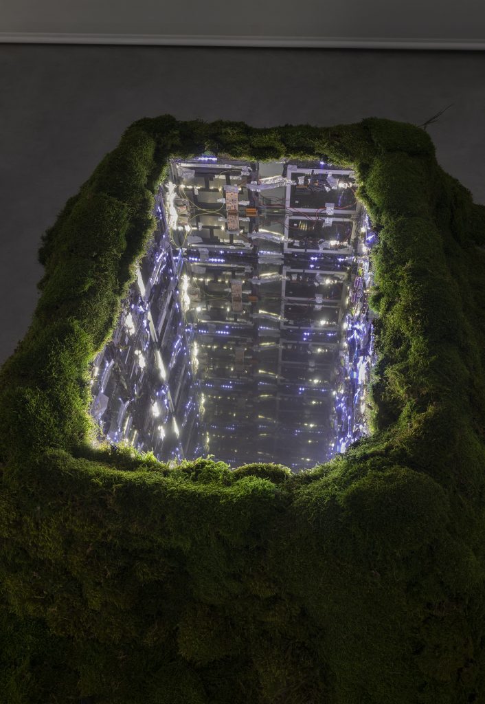 Questa contemporanea e metamorfica processione – affiancata da una selezione di Ponycore serie, che stimola a lasciarsi cadere sprofondando dove il sonno si mescola al sogno e i confini si dissolvono liberandosi – culmina nell’installazione tanto immersiva quanto straniante che porta il titolo di Wall City. Buia a stimolare la vista, odorosa di muschio per sollecitare l’olfatto, suonata da un ruscello che chiama, forte, l’udito: che cos’è? Ricalcando l’estetica Cyber punk della cinematografia giapponese, la scatola magica Wall City non è affatto un luogo sereno come ordinariamente siamo portati a immaginare bensì è un’ibridazione filosofico tecnologica delle grandi metropoli asiatiche, in cui l’individuo diventa parte del paesaggio suburbano, e anzi deve imparare a viverlo e incorporarlo per non esserne sommerso.