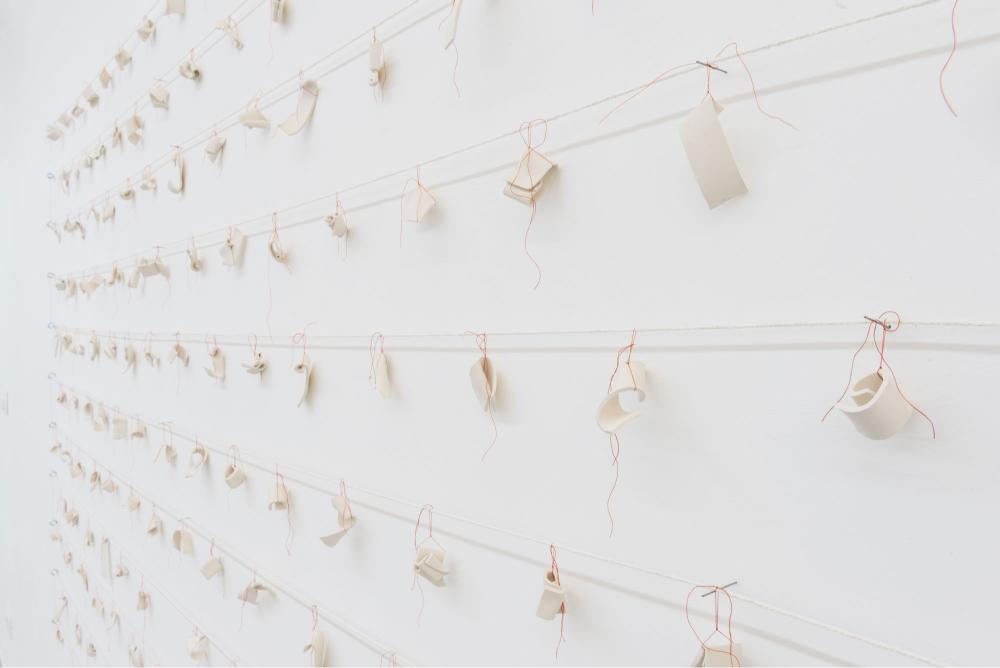 Ad accogliere i visitatori vi è l’installazione temporanea Untie (2025), composta da numerosi coriandoli in terracotta bianca. L’invito è quello di staccarne uno e portarlo via con sé, restituendo su un foglietto di carta un pensiero o un desiderio. La tradizione a cui si lega questo processo è quella dell’omikuji, gli oracoli scritti sui bigliettini, che secondo la tradizione giapponese, si annodavano ai rami degli alberi quando le predizioni non erano favorevoli.