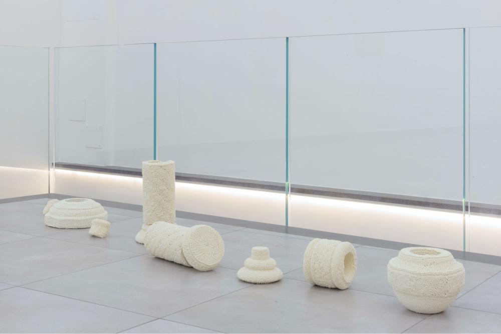 La stessa serie, con About Objects Vase (2025), abita il pacifico giardino che chiude il percorso della galleria, mentre About Object Amphora (2025) pende, nuovamente, in solitaria asimmetria su un solo lato dello spazio. Qui i frammenti di terracotta pulsano come spettri acromi che non infestano ma coesistono; brillano di bianco acido e sembra domandino di essere visti tra l’infinità di altri uguali.