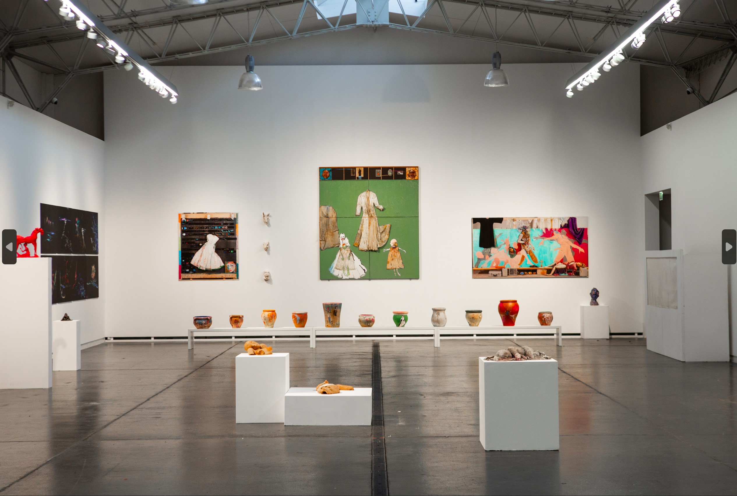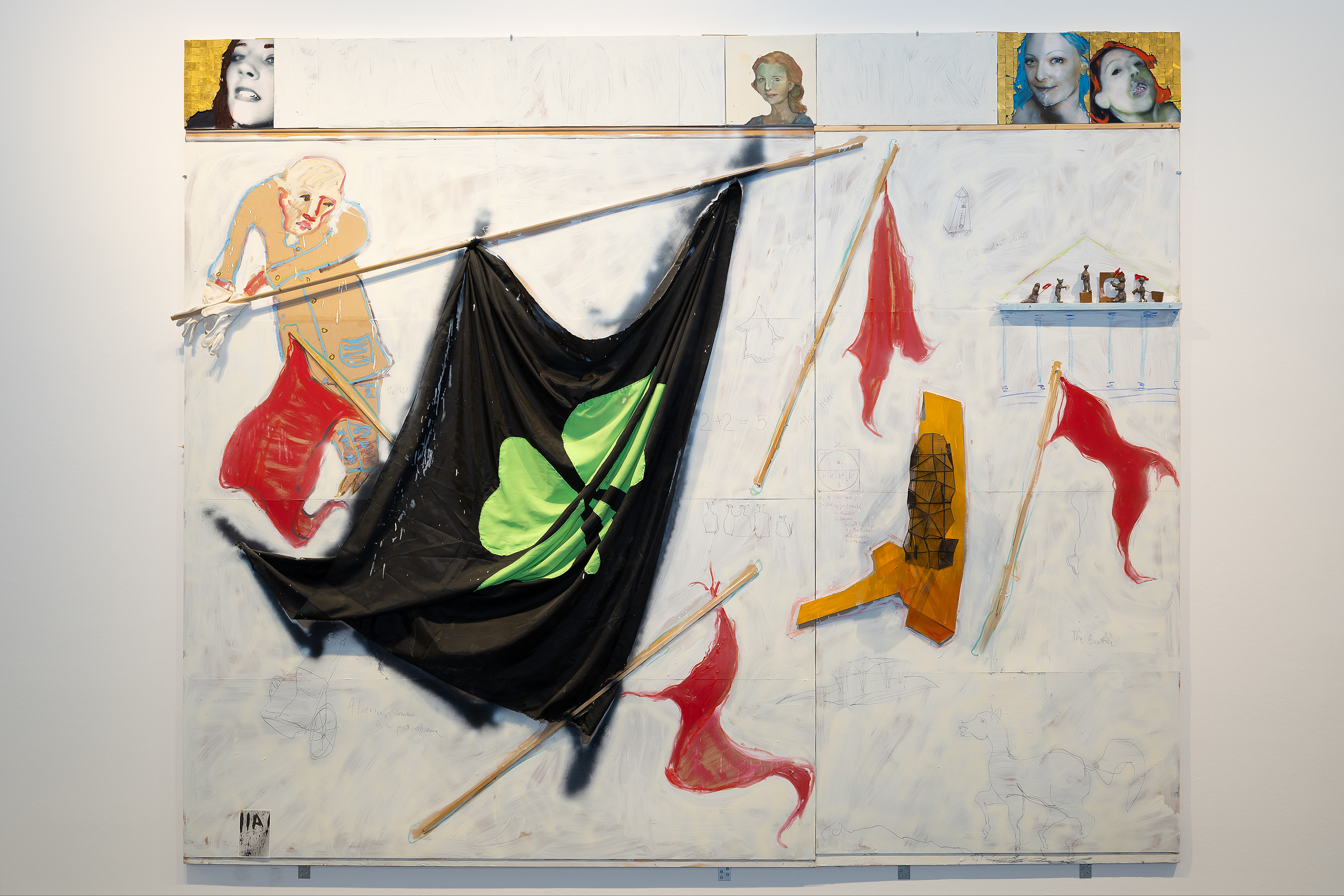E proprio molte performance sono la sostanza vitale di tante opere in mostra, per un’arte che vibra di rimandi e tracce, in un rispecchiamento continuo tra i diversi momenti creativi e forme espressive. Dalle fotografie delle performance sovra dipinte nasce infatti la serie dei Neri del 2022: volti, corpi e figure umane appaiono dall’oscurità tra bagliori di colori svelti, come fuochi fatui. Ma è nella serie dei Retablo, del 2021, che l’eco delle azioni performative risuona con forza più bruciante. «Ogni Retablo è frutto di una scheggia impazzita ed incandescente che fugge da uno spettacolo e va a bruciare una tela», spiega l’artista. Nei Retablo, la scenografia e i costumi diventano elementi a rilievo su grandi tele e, come relitti, imbalsamano le scene, conferendo a queste opere un’aura di reliquiari.