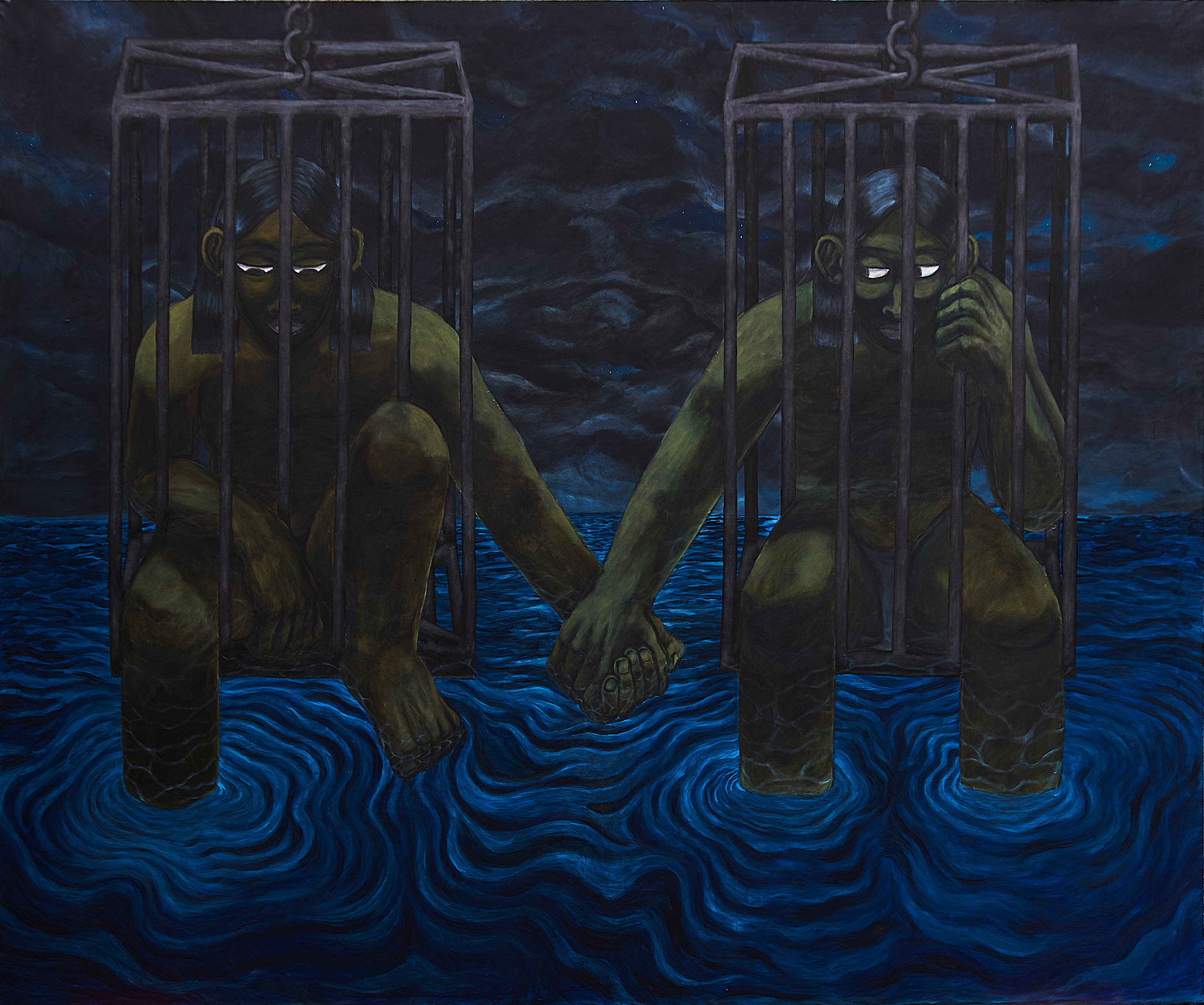Gli orfani è un dipinto maggiormente biografico in quanto rispecchia la situazione dell’artista ma si concentra sulla condizione umana della solitudine. Due creature si trovano sospese e sedute all’interno di gabbie claustrofobiche con sbarre massicce. I loro piedi sono immersi nel mare ma qualcosa li rincuora: la reciproca prossimità, mano nella mano affrontano la cattività insieme. È interessante notare come sia trattata la superficie dell’acqua: una sostanza semiliquida più che completamente fluida.