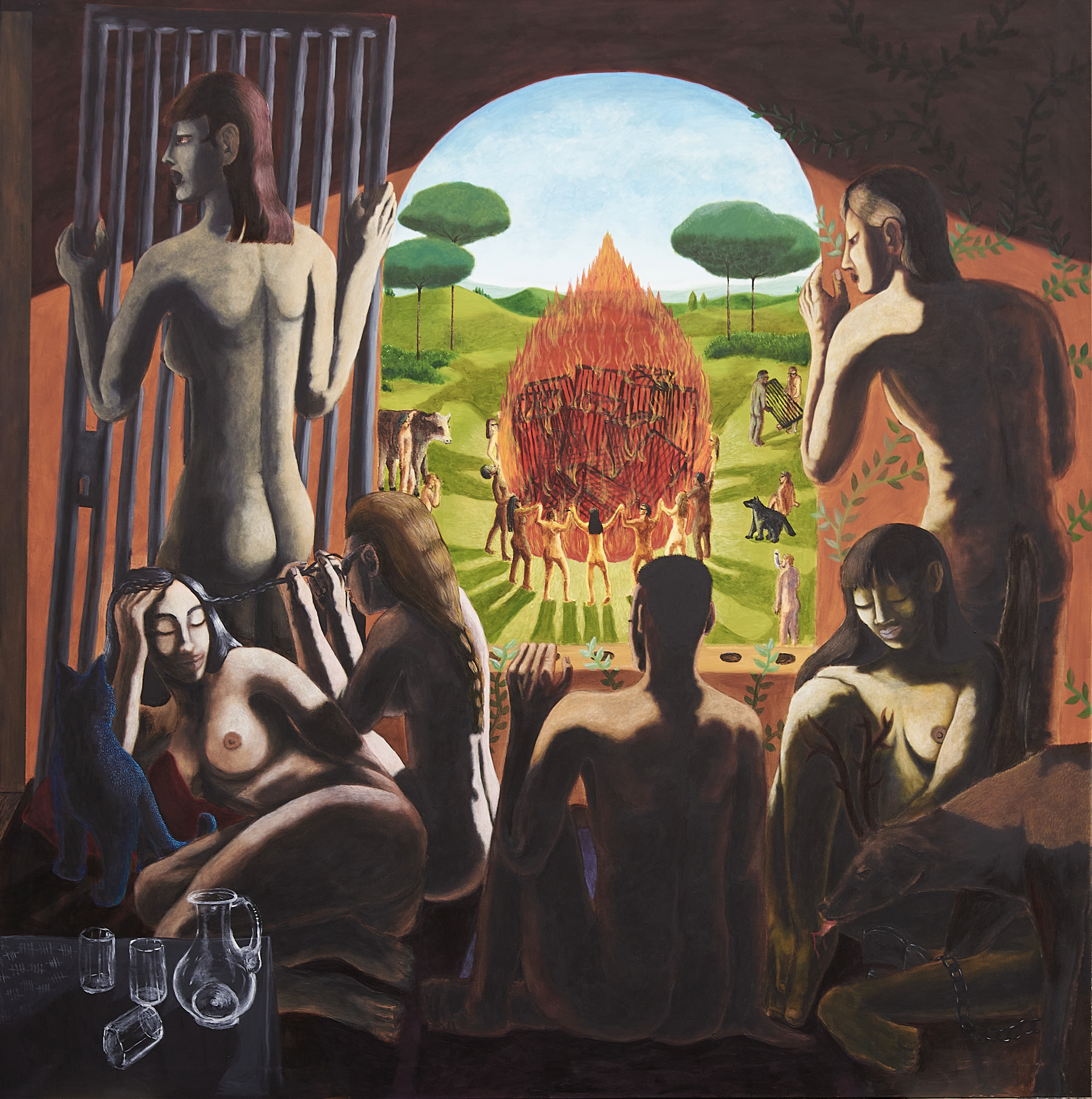 Ne Il sole dopo tredici lune la volontà di fratellanza e la forza della natura trionfano, gli animali interagiscono con i personaggi e una finestra si apre non si un cortile ma su uno spazio che appare sconfinato, al centro del quale si innalza un grande rogo. Alcuni uomini circondano le fiamme in un girotondo mentre altri portano delle grate di cancelli da ardere, sono nudi in quanto anche la veste avvolge il corpo in una forma di costrizione: è una maschera di civiltà calata dall’alto, se da una parte rispecchia il nostro estro creativo, altre volte è definito dal censo. Alcune figure si rilassano all’ombra di un portico, si intrecciano i capelli vicendevolmente in un gesto di un’autentica premura. Il gatto rappresenta l’oscurità della notte ma anche il lato selvatico dell’uomo, il buio della coscienza che oltrepassa le Colonne d’Ercole dell’ignoto.