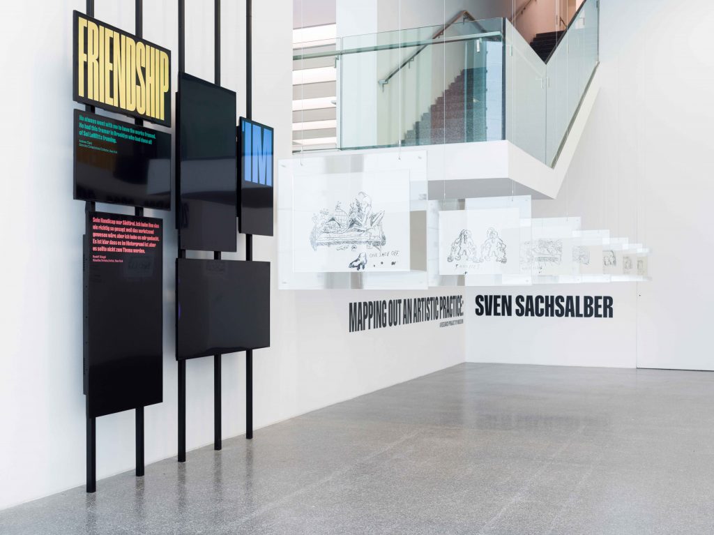 Tappe biografiche, luoghi di vita e lavoro di Sachsalber sono restituiti in mostra una imponente linea temporale a parete. A fare da bussola concettuale cinque filoni tematici – art, body, time, books, home, friendship – emersi da oltre trenta colloqui con amici e amiche, colleghi e colleghe, collaboratori e collaboratrici dell’artista. Tra i tanti personaggi non manca Rudolf Stingel, a cui Sachsalber aveva chiesto aiuto per inserirsi nella scena artistica newyorkese. Un’installazione di monitor a parete riporta alcuni estratti dalle interviste: si materializza così un ritratto a più voci di Sachsalber, frammentato, ma caldo, presente. I legami, la logica artistica e persino alcune caratteristiche fisiche di Sachsalber sono inoltre rievocati anche in maniera sottile nel raffinato allestimento di Claudia Polizzi.