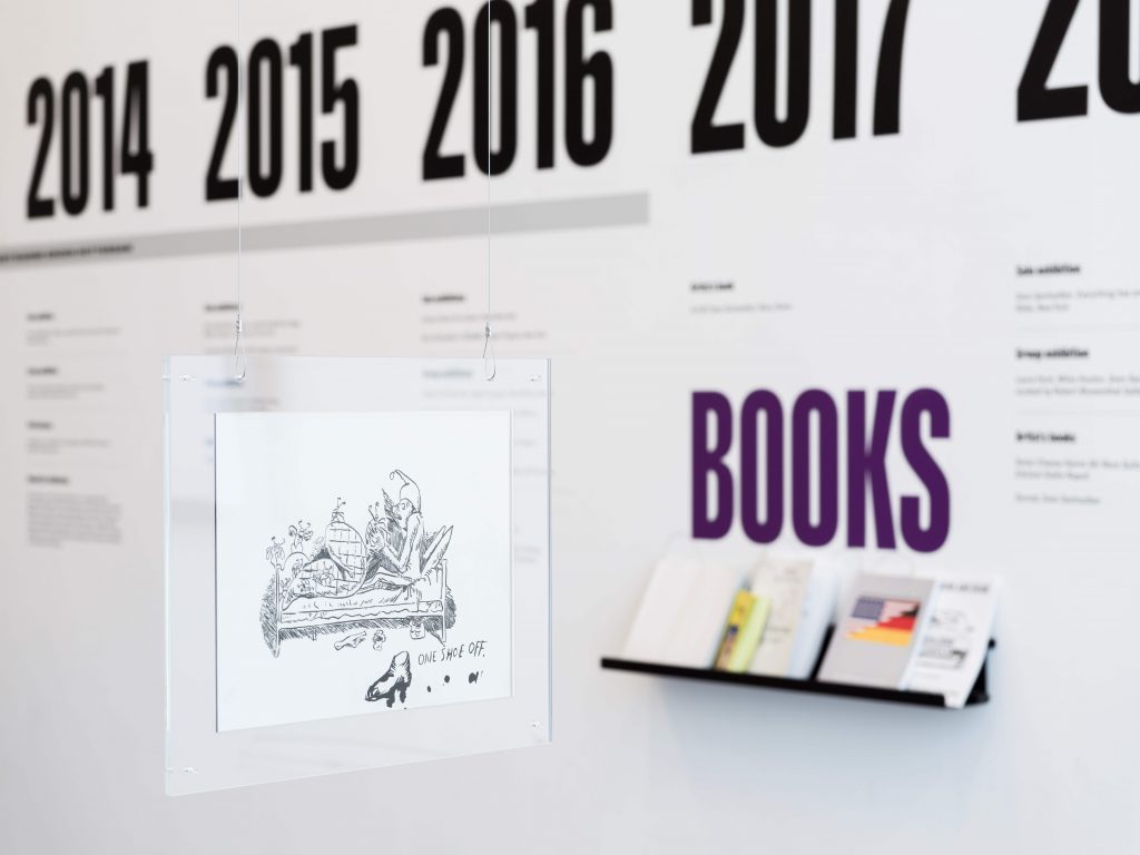 Una presenza importante in mostra sono i libri d’artista, in cui si manifesta immediatamente tutta l’ironia pungente e iconoclasta di Sachsalber, quel suo acuto palleggio concettuale con i riferimenti iconografici dell’immaginario tradizionale alpino e del mondo dello sci – come in Swiss Cheese 1992-1998 l’esilarante libro sulle tute da sci della nazionale svizzera. In No Drawing No Cry Sachsalber interviene, invece, su un’edizione originale di Kippenberger: del resto, tradire la tradizione della storia dell’arte era quello che Sachsalber rispettava, come ricorda Emanuele Guidi in un’intervista in mostra.