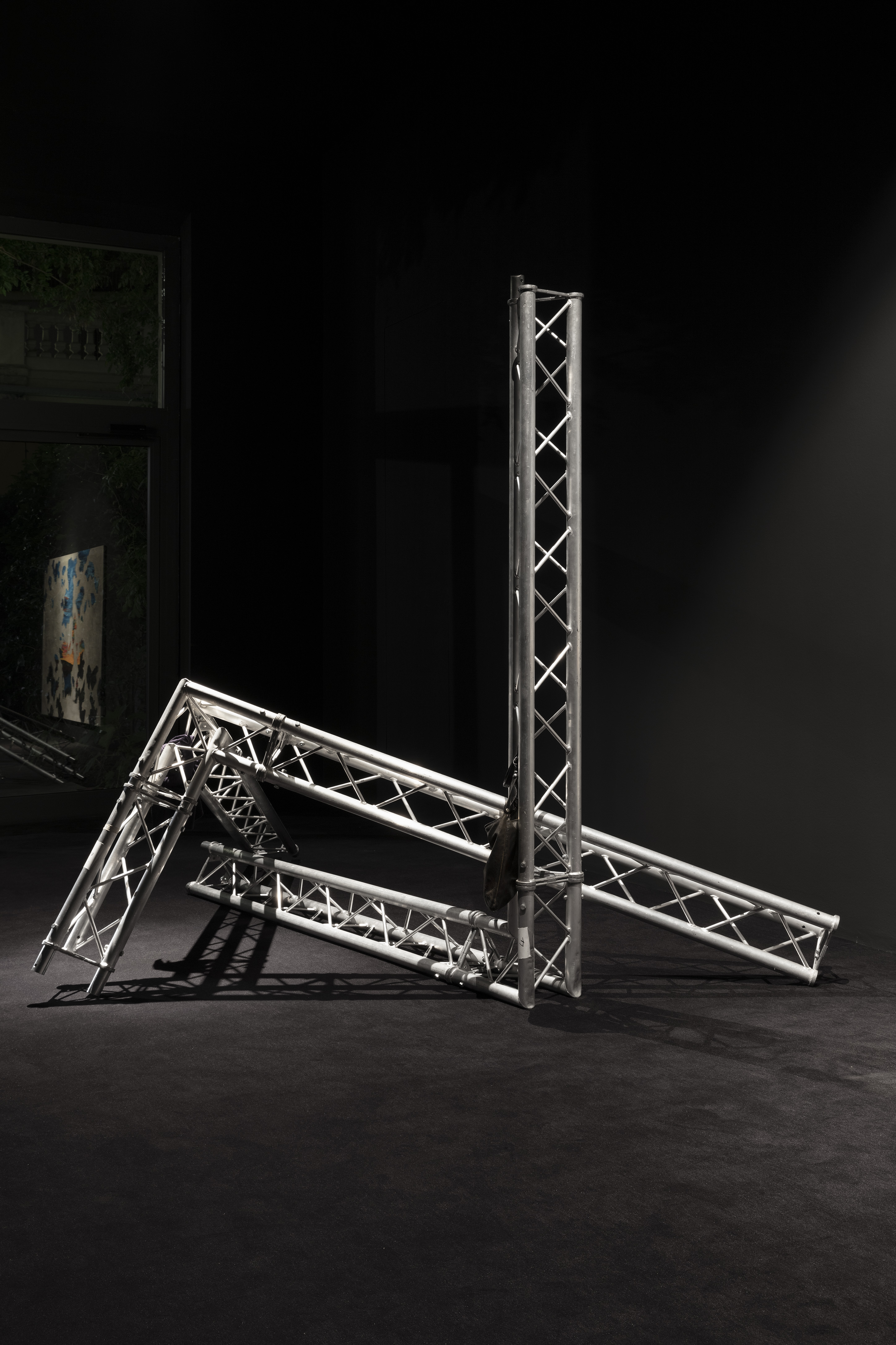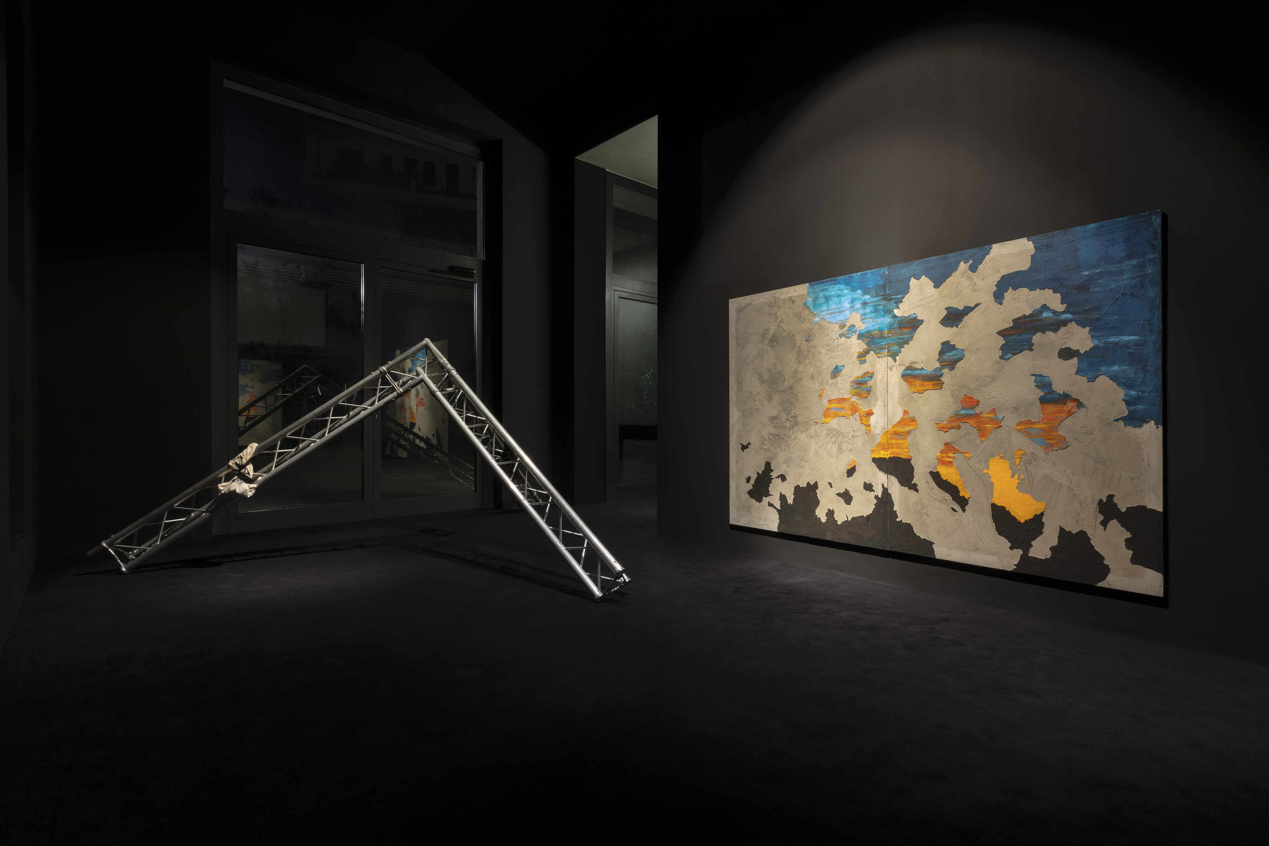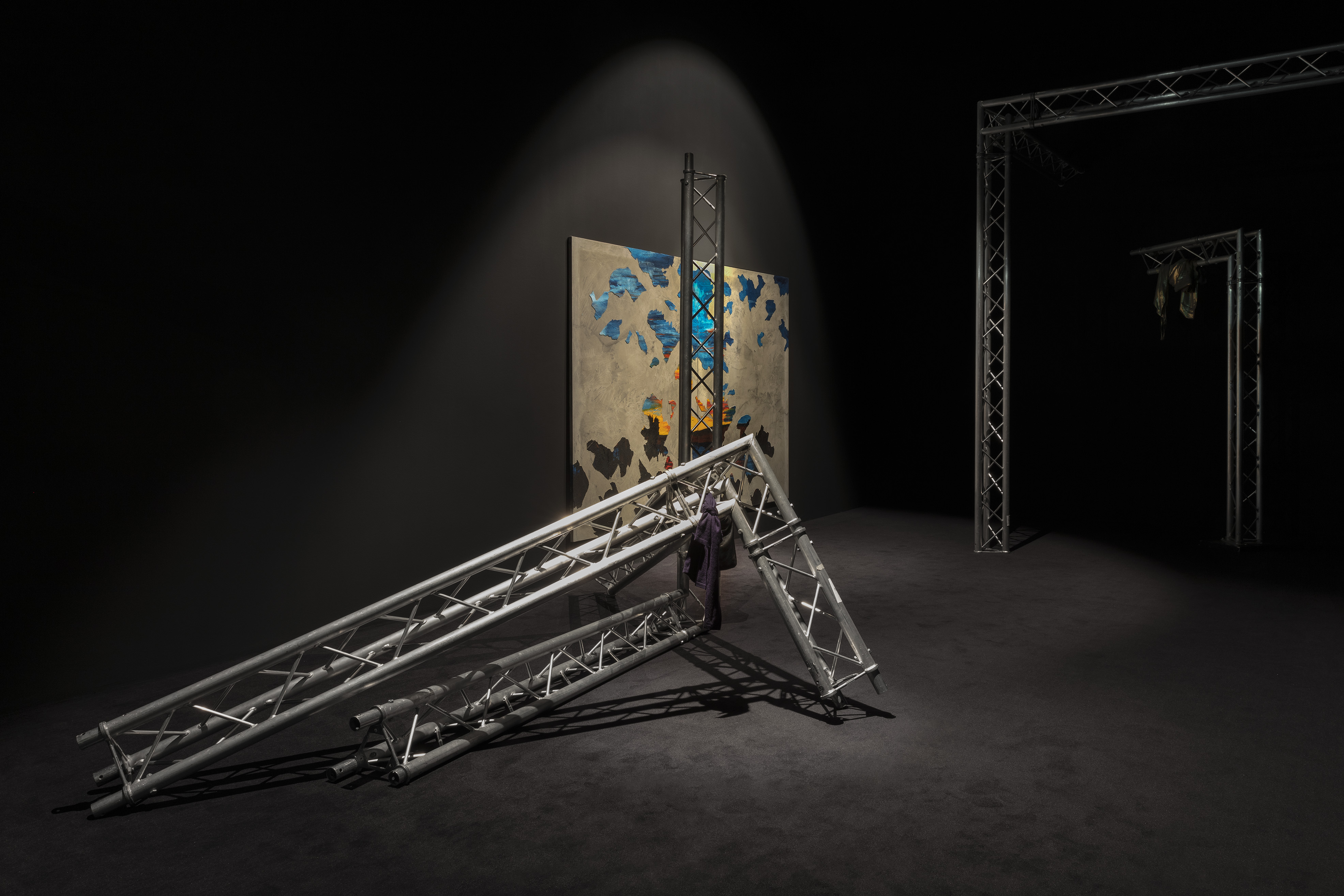 Lo spazio è pervaso da rovine metalliche tradotte nella serie di installazioni After (2020), impalcature che costituiscono parte fondante dell’apparato scenografico nell’architettura del concerto, creando così un gioco di rapporti spaziali volumetrici all’interno dello spazio espositivo. Le macerie sembrano essere crollate come a compimento di un grande e ultimo rituale prima del silenzio, feticci su cui qualcuno ha lasciato, o sacrificato, elementi d’abbigliamento ordinario.