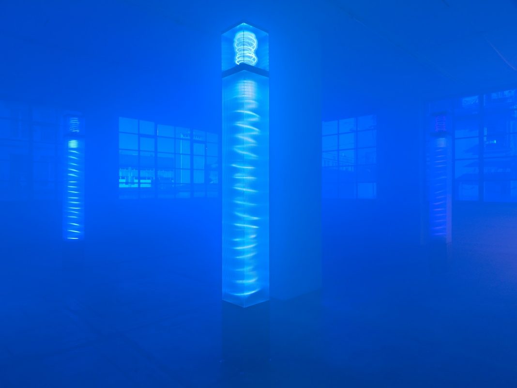 Alcuni dei totem di Grisi erano quest’anno alla Biennale di Venezia ospitati nella “cellula” dedicata alle artiste italiane degli anni Cinquanta e Sessanta. Sempre del 1968 è l’esemplare Volume of Air dove, grazie al neon disposto sugli spigoli della stanza ad evidenziare null’altro che lo spazio, riesce a dare forma al medium invisibile per eccellenza dell’aria. Appartenente alla temperie di quegli anni, tuttavia se ne distingue: non vuole reificare attraverso degli oggetti gli elementi della natura, ma aprire all’esperienza del mondo (anche psicologica e sicuramente immersiva) lo spettatore. Quindi, se non si riconosce nel gruppo dell’Arte Povera, tuttavia viene invitata a partecipare a una rassegna importante di Land Art nel 1971 a Boston, intitolata “Earth Air Fire Water: Elements of Art”, dove traspone nello spazio artificiale del museo l’esperienza della pioggia e della rifrazione della luce e delle forme nell’acqua.
