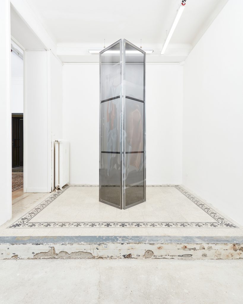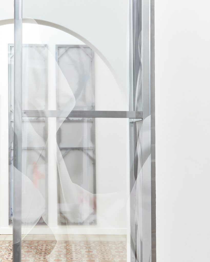 In galleria le due artiste ci portano all’interno delle antinomie indagate attraverso “anamorfosi materiche” – tramite sovrapposizioni di materiali e tecniche – che, man mano si osservano le opere in sala da diverse angolazioni, svelano forme inaspettate e contraddittorie. Opere che, viste di fronte, sono di serena percezione decorativa astratta, diventano poi interrogative evocazioni quasi fantasmatiche; forme di tradizionale “delicato” richiamo femminile, sottese alla superficie dell’opera, diventano drammatiche nella trasparenza obliqua. Con un lavoro rigoroso e severo, inquadrano in alluminio doversi “layer” di grafismo non scevro di evocazioni stilistiche di ascendenza mitteleuropea novecentesca. Gli Enclosure sono grandi telai di alluminio che incorniciano pannelli di chiffon stampati, semitrasparenti, cangianti a seconda del progredire dell’osservazione intorno.