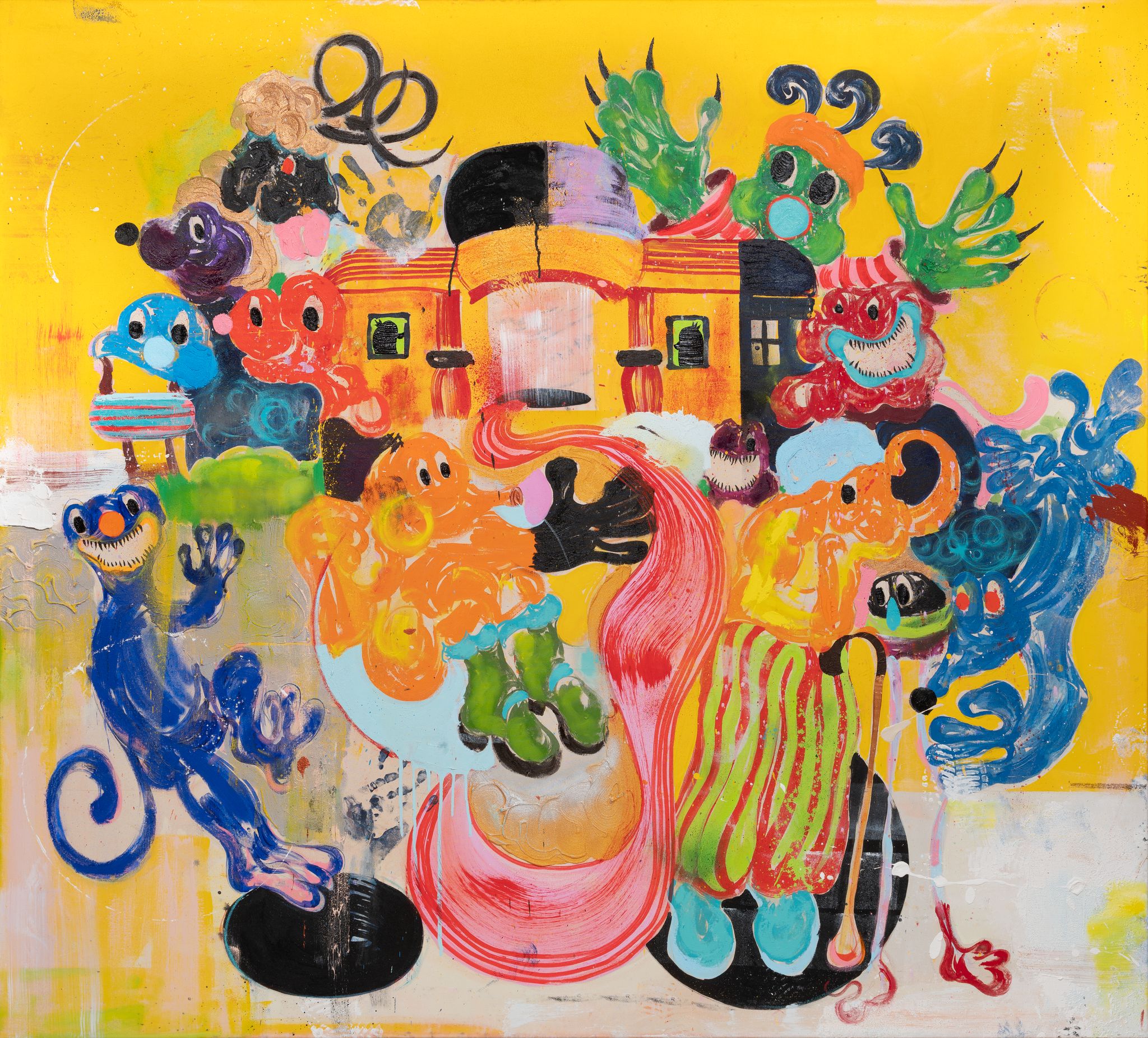Oil, acrylic, oil stick, spray paint and sand on canvas 180 x 200 x 4.5 cm